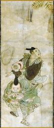 | Keywords: Manzai by unknown artist - wittig collection.jpg LargeImage en Scroll-mounted painting depicting a traditional Japanese 2-man comedy team know as manzai generic term at a period New Year celebration Ink watercolours on paper Unsigned or sign/seal lost as a result of damage/removal artist unknown Japan late 19th century or earlier self-authored scan painting is from a private collection; fam Wittig et cie self-authored scan painting by unknown artist unsigned 18 original painting PD-old Manzai artist unknown Wittig ptg-01 |