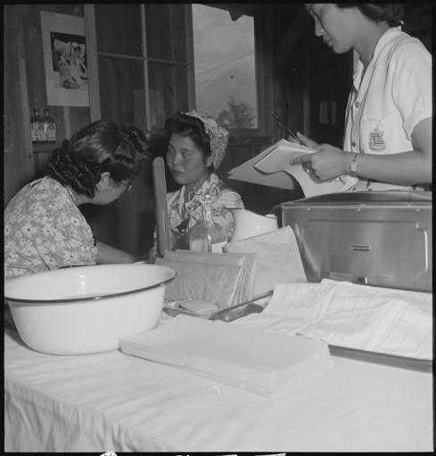 | Keywords: Manzanar Relocation Center, Manzanar, California. Young expectant mother (center) receives check-up . . . - NARA - 538142.jpg Scope and content The full caption for this photograph reads Manzanar Relocation Center Manzanar California Young expectant mother center receives check-up from her doctor left in the medical clinic now housed in a temporary building at this War Relocation Authority Center for evacuees of Japanese ancestry General notes 538142 Local identifier 210-G-C855 Department of the Interior War Relocation Authority 02/16/1944 - 06/30/1946 NARA-Author Lange Dorothea 1895-1965 Photographer 1372774 <br /> Still Picture Records Section Special Media Archives Services Division NWCS-S National Archives at College Park 8601 Adelphi Road College Park MD 20740-6001 1942-07-03 Record group Record Group 210 Records of the War Relocation Authority 1941 - 1989 Record group ARC 537 Central Photographic File of the War Relocation Authority compiled 1942 - 1945 Series ARC 536000 File unit File unit ARC Variant control numbers NAIL Control Number NWDNS-210-G-C855 Other versions <gallery> File Manzanar_Relocation_Center _Manzanar _California _Young_expectant_mother_ center _receives_check-up_ _ _ _-_NARA_-_538142 tif tif File Manzanar_Relocation_Center _Manzanar _California _Young_expectant_mother_ center _receives_check-up_ _ _ _-_NARA_-_538142 jpg jpg </gallery> NARA-cooperation PD-USGov Photographs by Dorothea Lange of Manzanar War Relocation Center |