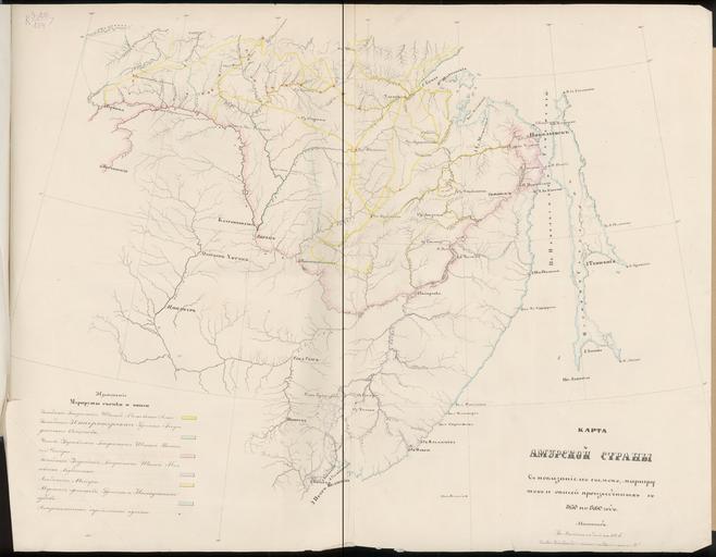 | Keywords: Map of the Amur Country with Evidence of Surveys, Routes and Schedules, Produceed from 1850 to 1860 WDL120.png Artwork ru Ка та Аму ского егиона с данными исследований ма ш утами и г афиками; составлена в пе иод между 1850-м и 1860-м годами fr Carte du pays de l Amour avec des indications des levés des itinéraires et des dates produits de 1850 à 1860 en Map of the Amur Country with Evidence of Surveys Routes and Schedules Produceed from 1850 to 1860 zh 阿穆尔国 图,包括勘测证据 路线和日程安排,1850-1860年绘制 pt Mapa do país de Amur com indícios de pesquisas rotas e horários produzidos de 1850 a 1860 ar خريطة لمنطقة الأمور مع أدلة للمسح، والطرق والجداول، مصنوعة من 1850 إلى 1860 ru а этой ка те изоб ажена южная часть Дальнего Востока России в том числе П иаму ье и ост ов Сахалин Показаны экспедиции п едп инятые п авительством России в этом егионе в 1850 1860-х годах каждая из кото ых отмечена своим цветом Цветовая коди овка асшиф овывается в азделе условных обозначений В этот пе иод Россия п овела яд тщательных и всесто онних исследований Дальнего Востока с целью составления ка т накопления знаний о место ождениях полезных ископаемых в егионе и дема кации г аницы с Китаем Экспедиция под командованием Геннадия евельского сделала яд важнейших отк ытий подтве див что Аму является судоходной екой во всем его течении и что Сахалин это ост ов В августе 1850 года евельский основал иколаевский пост нынешний иколаевск-на-Аму е в дельте еки Аму а сделав его тихоокеанским фо постом Как отмечено на ка те п олив между мате иком и ост овом Сахалин был назван в честь евельского сов еменный Тата ский п олив Аму является самой длинной екой на Дальнем Востоке России и оп еделяет г аницу между Россией и севе о-восточным Китаем fr Cette carte présente le sud de l'Extrême-Orient russe comprenant la région du fleuve Amour et l'île de Sakhaline Elle indique les itinéraires des expéditions entreprises par le gouvernement russe dans cette région entre 1850 et 1860 chacun étant représenté par une couleur différente identifiée dans la légende en bas à gauche cette époque la Russie conduisit de vastes explorations rigoureuses de l'Extrême-Orient afin de dresser des cartes d'acquérir des connaissances sur les gisements minéraux et de définir la frontière avec la Chine L'expédition dirigée par Guennadi Nevelskoï fit certaines des plus importantes découvertes notamment en confirmant que l'Amour était navigable sur toute sa longueur et que Sakhaline était une île En août 1850 Nevelskoï fonda la colonie de Nikolaïevsk aujourd'hui Nikolaïevsk-sur-l Amour à l'embouchure de l'estuaire de l Amour en tant qu'un avant-poste sur le Pacifique Comme l indique la carte le détroit entre le continent et l'île de Sakhaline reçut le nom de Nevelskoï l'actuel détroit de Tartarie L'Amour est le plus long fleuve de l'Extrême-Orient russe et il définit la frontière entre la Russie et le nord-est de la Chine en This map depicts the southern part of the Russian Far East including the Amur River region and Sakhalin Island It shows the routes of the expeditions undertaken by the Russian government in this region in 1850-60 each marked by a different color identified in the legend at the lower left In this period Russia conducted rigorous and extensive explorations of the Far East to create maps gain knowledge about mineral deposits and demarcate the border with China The expedition led by Gennadii Nevelskoi made some of the most important discoveries including confirming that the Amur was navigable along its entire length and that Sakhalin is an island In August 1850 Nevelskoi founded Nikolaevskii Post present-day Nikolaevsk-on-Amur at the head of the Amur River estuary as an outpost on the Pacific As depicted on the map the strait between the mainland and Sakhalin Island was named after Nevelskoi present-day Strait of Tartary The Amur is the longest river in the Russian Far East and defines the border between Russia and northeastern China zh 图描述了俄罗斯 的南部 区,包括阿穆尔河 区和库页岛 图显示了俄罗斯政 1850-60 年 间 该 区的探险路线,每 路线以不同的 色标注,图例位于 图左下角 此 间, 过对 进行严密 广泛的探索,俄罗斯绘制 图,获取 关矿藏的知识以及与中国划定边界 由格莱德·涅维尔斯科 率领的探险队取得了 些重要发现,包括确认阿穆尔河的整 河流 可 航以及库页岛是 座岛屿 1850 年 8 ,涅维尔斯科 阿穆尔河河口的前端设立了尼科拉 夫斯基哨岗(今阿穆尔河的尼古拉 夫斯克), 为太平洋上的前哨 正如 图 绘,大陆与库页岛之间的海峡以莱维斯基命名(今鞑 海峡) 阿穆尔河是俄罗斯 长的河流,划定了俄罗斯与中国 北的边界 pt Este mapa mostra a parte sul do Extremo Oriente Russo incluindo a região do rio Amur e da ilha de Sakhalin Ele mostra as rotas das expedições realizadas pelo governo russo nesta região e