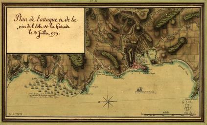 | Keywords: Map of the Attack and the Taking of the Island of Grenada on July 3, 1779 WDL375.png 1779 Artwork ru Озанн Пье 1737-1813 fr Ozanne Pierre 1737-1813 en Ozanne Pierre 1737-1813 zh 奥赞 皮埃尔 1737-1813 pt Ozanne Pierre 1737-1813 ar أوزان بيير 1737-1813 es Ozanne Pierre 1737-1813 ru Ка та шту ма и захвата ост ова Г енада 3 июля 1779 г fr Carte de l apos;attaque et de la conquête de l apos;île de Grenade le 3 Juillet 1779 en Map of the Attack and the Taking of the Island of Grenada on July 3 1779 zh 1779年7 3日攻占格林纳达岛 战图 pt Mapa do Ataque e da Tomada da Ilha de Granada em 3 de julho de 1779 ar خريطة الهجوم وأخذ جزيرة غرينادا في 3 تموز 1779 ru Ост ова Г енада Доминика Сен- Винсент Г енадины и Тобаго по окончании Семилетней войны 1756-1763 гг пе ешли от Ф анции к Англии Ф анция в еменно вновь захватила господство над этими ост овами во в емя Аме иканской войны за независимость последствия кото ой повлияли на весь ми а этой художественно и тщательно составленной ф анцузской военной ка те айона го ода Сент- Джо джес и бухты изоб ажено нападение ф анцузских войск 1779 года на ост ов Г енада находившийся в то в емя под конт олем Великоб итании а ка те изоб ажена бе еговая линия бе еговые о иенти ы яко ные стоянки сеть коо динат го ода Сент- Джо джес и д угих поселений асположение дивизионов и ук еплений англичан до оги астительность пахотные земли и ельеф а ка те также изоб ажено количество и асположение ко аблей ф анцузского флота у олинье -Пойнт места высадки ф анцузов а также ма ш ут ф анцузских войск к азличным ст атегическим объектам плантациям асположенным около и за го одом Сент-Джо джес Ка та входит в се ию ка т выполненных аква елью художником и ка тог афом Пье ом Озанном 1737-1813 гг с изоб ажением сцен с ажений между ф анцузами и англичанами в восточной части Ка ибских ост овов в годы Аме иканской войны за независимость <br>Г енада битва 1779 г fr Les îles de la Grenade de la Dominique de Saint- Vincent des Grenadines et Tobago furent cédées par la France à l'Angleterre à la suite de la fin de la guerre de Sept Ans 1756-63 La France a repris temporairement ces îles à la fin des années 1770 au cours de la période de la Guerre d'Indépendance des États-Unis un conflit qui a eu des implications à l'échelle de l'hémisphère Cette carte de l'armée française élégante et bien exécutée des environs de Saint- Georges et du port montre l'attaque française de juillet 1779 sur la Grenade tenue par les anglais La carte inclut les côtes et leurs caractéristiques les mouillages un quadrillage de Saint- Georges d'autres établissements les batteries et les fortifications anglaises les routes ainsi que des représentations picturales de la végétation des champs cultivés et du relief La carte montre également la taille et la position de la flotte française au large de l'Anse Molinière le site français de débarquement ainsi que l'itinéraire emprunté par les troupes françaises vers différents sites stratégiques plantations près et derrière la ville de Saint- Georges La carte fait partie d'une série d'aquarelles et de cartes par l'artiste et cartographe Pierre Ozanne 1737-1813 représentant des scènes de combat dans l'est des Caraïbes entre les Français et les Britanniques en rapport avec la Guerre d'Indépendance des États-Unis <br>Bataille de Grenade 1779 en The islands of Grenada Dominica St Vincent the Grenadines and Tobago were ceded by France to Britain following the close of the Seven Years' War 1756-63 France temporarily recaptured these islands in the late 1770s during the period of the U S Revolutionary War a conflict that had hemispheric implications This elegant well-executed French military map of the vicinity of St George's and the harbor depicts the July 1779 French attack on British-held Grenada The map includes coastline coastal features anchorages a grid of St George's other settlements British batteries and fortifications roads and pictorial representations of vegetation cultivated fields and relief The map also shows the size and position of the French fleet off Molinière's Point the site of the French landing and the route taken by French troops to various strategic sites plantations near and behind the town of St George's The map is part of a series of watercolors and maps by the artist and cartographer Pierre Ozanne 1737-1813 depicting battle scenes in the eastern Caribbean between the French and British related to the U S Revolutionary War <br>Grenada Battle of 1779 zh 七年战争(1756-63 年)结 后,法国将格林纳达 多米尼加 文森特 格林纳丁斯和多巴哥等岛屿割让给了英国 18 世纪 70 年代美国独立战争 间,法国曾暂时 夺回这些岛屿, 美国独立战争对其 整个半球都产生了影响 这幅精美精确的 关 乔治 区及海港的法国军事 图 描绘了 1779 年 7 法国进攻英国占领的格林纳达岛的情况 该 