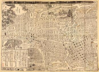 | Keywords: Map of Bushū Toshima District, Edo WDL9931.png Artwork ru Ка та айона Бусю Тосима Эдо fr Carte du district de Bushū Toshima à Edo en Map of Bushū Toshima District Edo zh 武州丰岛郡江户庄图 pt Mapa do distrito de Bushū Toshima Edo ar خريطة لمنطقة بوشو توشيما، إيدو ru Эта абота была пе епечатана с кадаст ового плана впе вые созданного около 1630 1631 гг на кото ом указаны землевладения в цент е Эдо Токио Исходная ка та считается ста ейшим и наиболее точным сох анившимся планом го ода многочисленные копии с нее делались до конца пе иода Эдо 1603 1868 гг Ка та обладает несколькими ха акте ными че тами одна из кото ых состоит в том что все текстовые пометки читаются в одном и том же нап авлении как на сов еменных ка тах Она также включает г афические изоб ажения значимых объектов к кото ым относятся нап име замок Эдо водоем а также основные х амы и места поклонения Севе на ка те находится в п авом ве хнем углу В амке внизу слева асположена схема с указанием асстояний Расстояние по ве тикали неп опо ционально велико по с авнению с асстоянием по го изонтали в езультате чего области севе нее замка Эдо не попали на ка ту Изоб ажены только жилые ква талы саму аев и местных го ожан в непос едственной близости от замка Замок Эдо был пост оен в се едине XV века и вок уг него стал об азовываться го од Токугава Иэясу 1543 1616 гг основатель сёгуната Токугава и его наследники восстановили замок и способствовали азвитию го ода Эдо <br>Ксилог афия; Иллюст и ованные ка ты; едвижимое имущество; Г авю ы на де еве fr Cet ouvrage est une réimpression d'une carte cadastrale produite à l'origine entre 1630 et 1631 montrant la possession des terres au centre d'Edo Tokyo La carte originale est considérée comme étant le plan le plus ancien et le plus précis de la ville Elle fit l'objet de nombreuses reproductions jusqu'à la fin de la fin de la période Edo 1603 1868 Elle présente plusieurs caractéristiques déterminantes ; par exemple les étiquettes de texte sont écrites dans le même sens comme pour les cartes modernes Elle inclut également des représentations picturales des lieux importants tels que le château d'Edo le réservoir et ses principaux temples et sanctuaires La carte est orientée avec le nord en haut à droite Dans le cadre en bas à gauche un tableau indique les distances La distance verticale est beaucoup plus longue que la distance horizontale excluant de la carte les zones au nord du château d'Edo Seuls les quartiers résidentiels des samouraïs et des citadins locaux à proximité immédiate du château sont dessinés Le château d'Edo fut construit au milieu du XV<sup>e</sup> siècle puis une ville commença à l'entourer Tokugawa Ieyasu 1543 1616 fondateur du shogunat Tokugawa et ses successeurs restaurèrent le château et développèrent la ville d'Edo <br>Xylographie; Cartes picturales; Biens immobiliers; Gravures sur bois en This work is a reprint of a cadastral map originally produced around 1630 31 showing land ownership in central Edo Tokyo The original map is considered the oldest and most accurate extant plan of the city and multiple reproductions of it were made until the end of the Edo period 1603 1868 The map has several defining features one of which is that all text labels read in the same direction in the style of modern maps It also includes pictorial representations of significant areas such as Edo Castle the reservoir and major temples and shrines The map is oriented with north toward the upper right The box on the lower left is a chart indicating distances Vertical distance is disproportionately greater than horizontal distance which results in the exclusion of areas north of Edo Castle from the map Only the residential quarters of the samurai and local townspeople in the immediate vicinity of the castle are shown Edo Castle was built in the mid-15th century and a town started to form around it Tokugawa Ieyasu 1543 1616 founder of the Tokugawa shogunate and his successors restored the castle and developed the city of Edo <br>Block printing; Pictorial maps; Real property; Woodcuts zh 这是 幅 籍图的副 该 籍图 绘制于约 1630-1631 年,描绘了首都江户( 京)的 原 的 图被认为是现存 古 精确的江户 图, 江户时 (1603-1868 年)结 之前曾被多次复制 该 图 几个明确的特点,其中之 是采用现代 图的样式, 的文 标签 沿同 方向读取 此外,它还用图案标示重要区域,如江户城 水库以及主要寺庙和神社 该 图右上方向为北方 左下角的方 是标示 离的图表 垂直 离不成比例 大于水平 离,从 导致 图上 能包括江户城以北的 区,只显示了城堡附近的武士和 方城镇居民的住宅区 江户城建于 15 世纪中叶,并 座城市 始围绕它 建 德 幕 的创始人德 家康(Tokugawa Ieyasu,1543-1616 年)的继任 修复城堡并建立了江户 <br> 版印刷; 图示 图; 不动产; 刻 pt Este trabalho é uma reimpr
