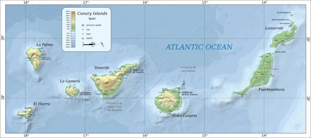 | Keywords: Map of the Canary Islands.svg de Karte der Kanarischen Inseln auf Englisch en Map of the Canary Islands ro Harta Insulelor Canare 2007-08-02 Self-made in Inkscape by w User Mysid Based on SRTM data as edited by CGIAR-CSI Place names based on the Open Streetmap Oona Räisänen Mysid other versions <gallery> File Map of the Canary Islands de svg de File Map of the Canary Islands-fr svg fr File Map of the Canary Islands-ro svg ro File Blank topographic map of the Canary Islands svg Blank topographic map for geolocation purpose File Blank administrative map of the Canary Islands svg Blank administrative map for geolocation purpose </gallery> Mysid translation possible Maps of the Canary Islands english language maps of Spain |