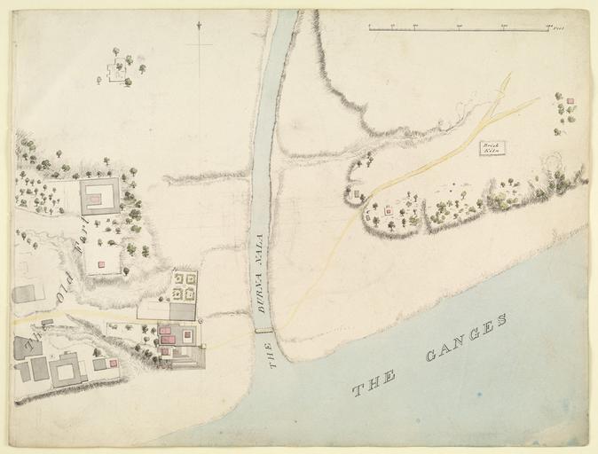 View Original:Map_of_the_confluence_of_the_Barna_and_Ganges_rivers_with_temples_and_the_old_fort_on_the_left_and_brick_kiln_on_the_right_Benares_by_James_Prinsep.jpg (937x712)