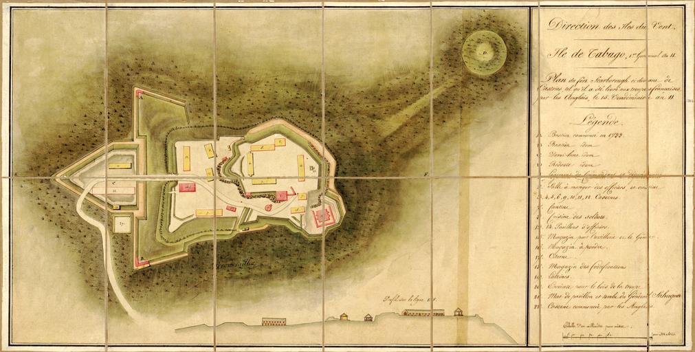 Keywords: Map of Fort Scarborough, Formerly Castries, as it was Delivered to French Troops, by the English, on the 15th of Vendémiaire Year 11 WDL686.png Artwork ru Ка та Фо та Ска бо о анее Каст и как она была пе едана ф анцузским войскам англичанами 15-го вандемье а год 11 fr Carte du Fort de Scarborough anciennement Castries  lorsqu'il fut donné à l apos;armée française par les Anglais le 15 Vendémiaire Année 11 en Map of Fort Scarborough Formerly Castries as it was Delivered to French Troops by the English on the 15th of Vendémiaire Year 11 zh 士嘉堡 图,原为卡斯特里,英国人于葡 11年15日将起移交给法国军队 pt Mapa do Forte Scarborough  antigo Castries como foi entregue às tropas francesas pelos ingleses no dia 15 de Vendémiaire Ano 11 ar خريطة قلعة سكاربورو، كاستريس سابقا، عندما سُلمت إلى القوات الفرنسية، من قبل الانجليز، في 15 فينديميير سنة 11 ru В эпоху колониальных завоеваний Голландия Англия и Ф анция ст емились получить конт оль над ост овом Тобаго В 1777 году ф анцузы владеющие ост овом в то в емя начали ст оительство к епости кото ую они назвали Фо т-Каст и В 1793 году ост ов захватили англичане но были вынуждены ве нуть его Ф анции по условиям Амьенского догово а 1802 года а плане изоб ажена к епость кото ую англичане называли фо т Ска бо о во в емя пе едачи ост ова англичанами ф анцузам а нем п едставлены сама к епость внут енние ст оения к епости едут а также художественное изоб ажение астительности и ельефа Даты на ка те п иведены в соответствии с новым ф анцузским календа ем п инятым после еволюции что подтве ждается ссылкой на месяцы вандемье и же миналь В попытке полностью уст анить т адиционное и х истианское влияние из жизни Ф анции после победы Ф анцузской еволюции был введен новый календа ь в кото ом использовались новые названия месяцев каждый из кото ых состоял из т ех десятидневных недель Исчисление лет велось от п овозглашения Ф анцузской Республики в сентяб е 1792 года Таким об азом 15-е вандемье а 11-го года означает15-ый день месяца вандемье осенний месяц название кото ого п оисходит от латинского <i> vindemia </i>или сбо виног ада 11-го года т е 7 октяб я 1802 года В 1805 году аполеон уп азднил эту систему летоисчисления и восстановил г иго ианский календа ь <br>К епости и фо тификационные соо ужения fr l'époque coloniale les Hollandais les Britanniques et les Français se disputaient le contrôle de l'île de Tobago En 1777 alors qu'ils étaient en possession de l'île les Français ont commencé à construire un fort qu'ils ont appelé Fort Castries Les Britanniques prirent l'île en 1793 mais furent obligés de la rendre à la France aux termes du Traité d'Amiens de 1802 Ce plan illustre le fort renommé Fort Scarborough par les Britanniques au moment de son transfert de la Grande-Bretagne à la France Elle montre la structure de la forteresse les bâtiments intérieurs une redoute ainsi qu'une représentation picturale de la végétation et du relief Le calendrier de référence de la carte est le calendrier révolutionnaire français elle fait notamment référence aux mois de Vendémiaire et Germinal Dans ses efforts pour éliminer toute influences traditionnelle et chrétienne de la vie française la Révolution française a institué un nouveau calendrier qui comprenait un ensemble de mois renommés et divisés en trois semaines de dix jours Les années étaient numérotées à partir de la proclamation de la République française en septembre 1792 Le 15 Vendémiaire an 11 fait donc référence au 15ème jour du mois de Vendémiaire dont le nom est dérivé du latin <i>vindemia</i> signifiant vendange de l'année 11 c'est-à-dire au 7 octobre 1802 En 1805 Napoléon abolit ce système et rétablit le calendrier grégorien <br>Forts et fortifications en In the colonial era the Dutch British and French vied for control of the island of Tobago In 1777 when they were in possession of the island the French began constructing a fort which they called Fort Castries The British captured the island in 1793 but were obliged to return it to France under the terms of the 1802 Treaty of Amiens This plan depicts the fort referred to by its British name of Fort Scarborough at the time of its transfer from Britain to France Shown are the structure of the fort its interior buildings a redoubt and pictorial representation of vegetation and relief In referring to dates the map uses the French revolutionary calendar as seen in the references to the months of Vendémiaire and Germinal In its efforts to eliminate traditional and Christian influences from French life the French Revolution instituted a new calendar that featured a set of renamed months divided into three ten-day weeks Years w