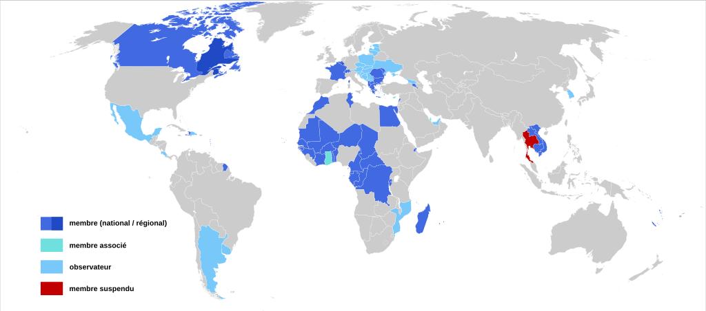 | Keywords: Map-Francophonie organisation fr.svg Sommaire Map of the Organisation internationale de la Francophonie Carte de l'OIF oct 2012 Mise à jour de Image Map-Francophonie organisation 2005 png Yug sur le fond File BlankMap-World6 compact svg domaine public 2008-10-22 Bourrichon <gallery> Image Map-Francophonie organisation 2008-en svg </gallery> Organisation internationale de la francophonie Maps of international organizations Distributional maps of the world | ||||