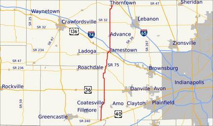 | Keywords: Map of Indiana State Road 75 (south).svg This is a map which shows the route of the southern portion of Indiana State Road 75 in the United States My own work using freely-available shape data and custom-written MapScript applications 2008-03-08 Omnedon Road maps of Indiana SR075S |