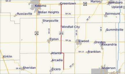 | Keywords: Map of Indiana State Road 213.svg This is a map which shows the route of Indiana State Road 213 in the United States My own work using freely-available shape data and custom-written MapScript applications 2008-03-16 Omnedon Road maps of Indiana SR213 |