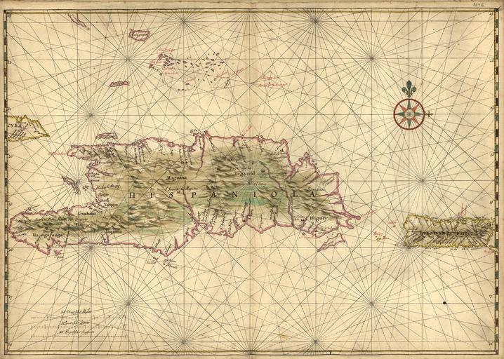 | Keywords: Map of the Islands of Hispaniola and Puerto Rico WDL4395.png Artwork ru Винкебунс Джоан 1617 1670 гг fr Vinckeboons Joan 1617-1670 en Vinckeboons Joan 1617-1670 zh 琼·维奇布斯,1617-1670 年 pt Vinckeboons Joan 1617-1670 ar جون فينكيبونز، 1617-1670 es Vinckeboons Joan 1617-1670 ru Ка та ост овов Эспаньола и Пуэ то-Рико fr Carte des îles d'Hispaniola et de Porto Rico en Map of the Islands of Hispaniola and Puerto Rico zh 伊斯帕尼奥拉岛和波多黎各岛 图 pt Mapa das Ilhas Hispaniola e Porto Rico ar خريطة أرض هيسبانيولا وبورتوريكو ru Джоан Винкебунс 1617 1670 гг голландский ка тог аф и г аве одился в семье художников фламандского п оисхождения Он аботал на голландскую Вест-Индскую компанию и в течение более 30 лет составлял ка ты кото ые использовались для то говых и военных т анспо тных пе евозок Он также был деловым па тне ом Джоана Блау одного из самых известных издателей ка т и атласов того в емени Винкебунс создал целую се ию из 200 укописных ка т кото ые использовались для составления атласов в том числе и знаменитого атласа Блау <em>Atlas Major</em> а этой ка те созданной п име но в 1639 г изоб ажены Ка ибские ост ова Эспаньола ныне те ито ия Гаити и Доминиканской Республики и Пуэ то-Рико а ка те показаны бе еговые линии бе еговые о иенти ы потенциальные опасности для навигации поселения админист ативные айоны еки г афические изоб ажения ельефа и локсод омии используемые для навигации Геог афические названия п иведены на испанском или на голландском языке Ка та была частью укописного атласа п инадлежавшего голландской фи ме Ге а да Хюлста ван Келена кото ая публиковала мо ские атласы и сп авочники судоходства на п отяжении двух столетий После пе едачи фи мы по наследству атлас п иоб ел и азоб ал на отдельные ка ты книгото говец из Амсте дама Ф еде ик юлле кото ый в 1887 г п одал 13 ка т из атласа авто ом кото ого считается Винкебунс коллекционе у и библиог афу Ген и Ха иссу Ка та является частью коллекции Ген и Ха исса х анящейся в Библиотеке Конг есса <br>Отк ытия и исследования; Эспаньола; Рукописные ка ты fr Joan Vinckeboons 1617-1670 était un cartographe et graveur néerlandais issu d'une famille d'artistes d'origine flamande Employé de la Compagnie néerlandaise des Indes occidentales il a produit pendant plus de 30 ans des cartes destinées à la marine militaire et marchande néerlandaise Il a travaillé avec Joan Blaeu l'un des plus importants éditeurs de cartes et d'atlas de l'époque Vinckeboons a dressé une série de 200 cartes manuscrites qui ont été reproduites dans plusieurs atlas dont le célèbre <em>Atlas Major</em> de Blaeu Cette carte datant approximativement de 1639 montre l'île caribéenne d'Hispaniola aujourd'hui Haïti et la République Dominicaine et celle de Porto Rico Cette carte montre le tracé et les caractéristiques des côtes les dangers de navigation les établissements humains les régions administratives les courants une représentation picturale du relief et des lignes de rhumb pour la navigation Les noms géographiques apparaissent soit en espagnol soit en néerlandais Cette carte faisait partie d'un atlas manuscrit appartenant à l'entreprise néerlandaise de Gerard Hulst van Keulen qui publia des atlas marins et des cartes de navigation pendant plus de deux siècles la disparition de l'entreprise l'atlas fut racheté et fragmenté par le marchand de livres d'Amsterdam Frederik Muller qui en 1887 vendit 13 cartes de l'atlas attribuées à Vinckeboons au collectionneur et bibliographe Henry Harrisse La carte fait partie de la collection Henry Harrisse à la Bibliothèque du Congrès <br>Découverte et exploration; Hispaniola; Cartes manuscrites en Joan Vinckeboons 1617 70 was a Dutch cartographer and engraver born into a family of artists of Flemish origin He was in the employ of the Dutch West India Company and for more than 30 years produced maps for use by Dutch mercantile and military shipping He was a business partner of Joan Blaeu one of the most important map and atlas publishers of the day Vinckeboons drew a series of 200 manuscript maps that were used in the production of atlases including Blaeu s <em>Atlas Major</em> This circa 1639 map shows the Caribbean islands of Hispaniola present-day Haiti and the Dominican Republic and Puerto Rico The map includes coastlines coastal features navigational hazards settlements administrative districts streams pictorial representation of relief and rhumb lines for navigation Geographic names appear either in Spanish or Dutch The map was once part of a manuscript atlas belonging to the Dutch firm of Gerard Hulst van Keulen which published sea atlases and pilots for over two centuries With the demise of the firm the at
