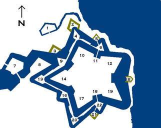 | Keywords: Map of Kastellet.PNG en Map of Copenhagen's citadel around 1750 <br/>1 Spitsbergens Lynette 2 Færø Reduit 3 Hetlands Reduit <br/>4 Lollands Kontregarde 5 Norges Reduit 6 Norges Ravelin <br/>7 Østerports Ravelin 8 Grønlands Bastion 9 Bornholms Ravelin <br/>10 Prinsens Bastion 11 Norgesporten 12 Prinsessens Bastion <br/>13 Møens Kontregarde 14 Kongens Bastion 15 Pinneberg Reduit <br/>16 Fyns Ravelin 17 Dronningens Bastion 18 Kongeporten Sjællandsporten <br/>19 Grevens Bastion 20 Falsters Kontregarde 21 Sjællands Reduit <br/>22 Sjællands Ravelin own <br/>Names from Guide til Københavns Befæstning ISBN 87-7279-029-6 Necessary Evil 2010-09-20 Citadellet Frederikshavn |