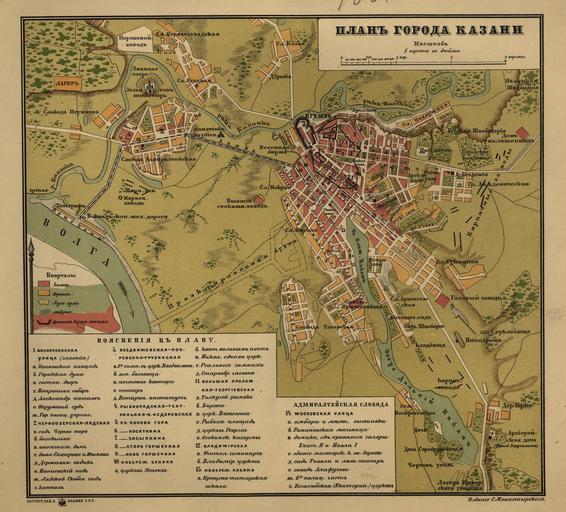 | Keywords: Map of Kazan, late XIX.jpg ru План Казани конца XIX века П едположительно из книги онасты ский С Иллюст и ованный спутник по Волге Казань Типо-литог афия Ключникова 1884 512 c http //tat-map ru/Kazan/do1917/Monastyrskiy_1884 jpg author before 1900 http //www uag kzn ru/history/generalnyj_plan/xix/ PD-old Historical maps of Kazan |