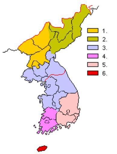Keywords: Map of Korean dialects.png Commentary Original name in Japanese Hei-an-dô dialect 平安道方 in Korean Pyeong'ando dialect ko 평안도 방언 now usually called Northwest dialect ko 북 방언 ; excluding Huchang former Pyeong'an Bukdo Original name in Japanese kan-kyô-dô dialect 咸鏡道方 in Korean Hamgyeongdo dialect ko 함경도 방언 now usually called Northeast dialect ko 동북 방언 ; including Huchang former Pyeong'an Bukdo and excluding South of Yeongheung ko 영 Hamgyeong Namdo Original name in Japanese kei-ki-dô dialect 京畿道方 in Korean Gyeonggido dialect ko 경기도 방언 now usually called Central dialect ko 중 방언 ; including Gyeonggido Hwanghaedo Gang'wondo and Southern Hamgyeongdo South of Yeongheung Hangyeong Namdo dialects and also including the dialect of Muju ko 무주 Jeolla Bukdo Original name in Japanese Zen-ra-dô dialect 全羅道方 in Korean Jeollado dialect ko 전 도 방언 now usually called Southwest dialect ko 남 방언 ; excluding the dialect of Muju Jeolla Bukdo Original name in Japanese kei-shô-dô dialect 慶尚道方 in Korean Gyeongsangdo dialect ko 경상도 방언 now usually called Southeast dialect ko 동남 방언 Original name Quelpart Island dialect now usually called Jeju dialect ko 주 방언 Demarcations of Korean Dialects by OGURA Shimpei self-made; based on OGURA S 1940 The Outline of the Korean Dialects Memoirs of the Reserch Department of the Toyo Bunko No 12 Tokyo 2007-12-29 竹庵 Released into public domain by self Korean language Linguistic maps of North Korea Linguistic maps of South Korea |