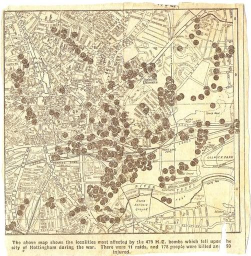 | Keywords: Map of the locations of bombing in Nottingham during the Second World War.jpg en Published in the Nottingham Evening Post 17 May 1945 2009-04-28 15 08 49 Nottingham Evening Post - 17 May 1945 Nottingham Evening Post other versions Custom license marker 2015 05 27 PD-old Uploaded with UploadWizard Maps of Nottingham |