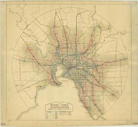 | Keywords: Map of Melbourne and environs electric railway time zones.jpg Isochrone map of Melbourne travel times to the city centre by tram or train Similar to Map of Melbourne and environs minimum railway or tramway time zones in the same publication but with more time margins http //handle slv vic gov au/10381/170543 State Library of Victoria Melbourne and Metropolitan Tramways Board between 1910 1922 http //digital slv vic gov au/webclient/MetadataManager pid 2609369 descriptive_only true This work is out of copyright<br>State Library of Victoria requests acknowledgement of the work's creator and the source of the work SLVIC-digitalimage 170543 2609371 PD-Australia Public transport maps of Melbourne Old maps of Melbourne Isochrone maps |