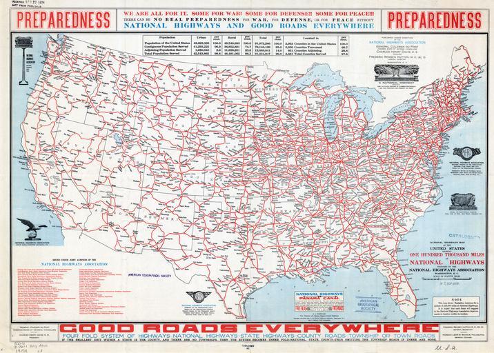 | Keywords: Map of United States Proposed National Highways, 1915 WDL11554.png  Artwork ru  алфо д Джон С fr Mulford John C en Mulford John C zh 马尔福德,约翰 C pt Mulford John C ar مَلْفورد، جون سي es Mulford John C ru Ка та национальных автомагист алей кото ые п едлагалось пост оить в США 1915 г fr Carte des États-Unis montrant les routes nationales proposées 1915 en Map of United States Proposed National Highways 1915 zh 美国拟建公路 图,1915 年 pt Mapa das rodovias nacionais propostas dos Estados Unidos 1915 ar خريطة للطرق السريعة الوطنية المُقترحة للولايات المُتحدة الأمريكية، 1915 ru В 1911 г в США была основана  ациональная ассоциация автомагист алей п изванная оказывать содействие  азвитию национальной сети качественных автомобильных до ог Выдвинув лозунг Хо ошие до оги всем  ациональная ассоциация автомагист алей выступила за создание четы еху овневой системы автодо ог п отяженностью 150 000 миль 241 402 км состоящей из автомагист алей и до ог кото ые войдут в сфе у компетенции феде ального п авительства штатов ок угов и го одов либо  айонов в составе ок угов  а этой ка те выпущенной ассоциацией в 1915 г показаны о иенти овочные ма ш уты важнейших автомагист алей сети общей п отяженностью 100 000 миль 160 934 км Таблица в ве хней части ка ты соде жит оценочные данные о численности и п оцентном соотношении населения п оживающего в ок угах по те  ито ии кото ых должны п ойти национальные автомагист али или в смежных ок угах Создатели ка ты связывали необходимость ст оительства хо оших до ог с обсуждавшимся в то в емя воп осом о готовности США к возможному вступлению в Пе вую ми овую войну в качестве союзника Великоб итании и Ф анции Помимо выпуска б ошю и  екламных п оспектов убеждавших г аждан в необходимости создания национальной системы до ог ассоциация издавала большое количество ка т Ка тог афические  аботы выполнялись коллективом п име но из 40 человек в бю о в Саут-Я муте штат  ассачусетс п инадлежавшем п езиденту и соуч едителю ассоциации Ча льзу Ген и Дэвису 1865 1951 гг Дэвис полагал что эти ка ты п инесут пользу национальной комиссии по автомагист алям на создание кото ой он надеялся и помогут штатам объединить свои до оги в единую национальную систему Конг есс США так и не п инял план п едложенный ассоциацией однако деятельность этой о ганизации и выпущенные ею ка ты способствовали делу создания национальной до ожной сети <br>Плани ование автомагист алей; До оги fr La NHA Association nationale pour les grandes routes fut établie en 1911 pour promouvoir le développement d'un réseau routier national amélioré aux États-Unis Sous le slogan « De bonnes routes pour tout le monde   » la NHA proposa un réseau routier de 241 402 kilomètres 150 000 miles reposant sur un quadruple système de routes au niveau national de l'État du comté de la commune ou de la municipalité Cette carte qu'elle émit en 1915 montre les tracés préliminaires des grandes routes les plus importantes de ce système parcourant au total 160 934 kilomètres 100 000 miles Le tableau dans la partie supérieure de la carte fournit une estimation des nombres et des pourcentages de personnes vivant dans les comtés traversés par ces axes routiers ou dans les comtés voisins La carte établit un parallèle entre la cause de la construction de bonnes routes et le débat qui avait lieu à l'époque sur la « préparation » à l'engagement possible des États-Unis dans la Première Guerre mondiale aux côtés de la Grande-Bretagne et de la France Outre la diffusion de brochures et de prospectus visant à convaincre les citoyens du besoin d'un réseau routier national la NHA produisit un grand nombre de cartes Le travail de cartographie était effectué dans un bureau de South Yarmouth dans le Massachusetts où près de 40 personnes étaient employées sur la propriété de Charles Henry Davis 1865 1951 président et cofondateur de la NHA Davis pensait non seulement que ces cartes seraient utiles à la commission des grandes routes nationales dont il espérait la création mais qu'elles aideraient également les États à intégrer leurs routes dans un système national Bien que le Congrès n'adoptât jamais le plan proposé par la NHA cette organisation et ses cartes servirent la cause d'un réseau routier national <br>Planification des routes; Routes en The National Highways Associa