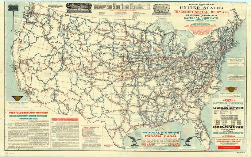 Keywords: Map of United States Proposed National Highways System, 1915 WDL11555.png Artwork ru Дженкинс Э  Э fr Jenkins E  E en Jenkins E E zh 罗森多恩,P A pt Jenkins E E ar جينكينز، إي إي es Jenkins E  E ru Ка та системы национальных автомагист алей кото ую п едлагалось создать в США 1915 г fr Carte des États-Unis montrant le réseau routier national proposé 1915 en Map of United States Proposed National Highways System 1915 zh 美国拟建国家公路体系 图,1915 年 pt Mapa do sistema de rodovias nacionais propostas dos Estados Unidos 1915 ar خريطة لنظام الطرق السريعة الوطنية المُقترحة للولايات المُتحدة الأمريكية، 1915 ru В 1911 г в США была основана ациональная ассоциация автомагист алей п изванная оказывать содействие азвитию национальной сети качественных автомобильных до ог Выдвинув лозунг Хо ошие до оги всем ациональная ассоциация автомагист алей выступила за создание четы еху овневой системы автодо ог п отяженностью 150 000 миль 241 402 км состоящей из автомагист алей и до ог кото ые войдут в сфе у компетенции феде ального п авительства штатов ок угов и го одов либо айонов в составе ок угов а этой ка те выпущенной ассоциацией в 1915 г показаны о иенти овочные ма ш уты 13 главных т ансконтинентальных автомагист алей сети выделены к асным цветом и связанной с ними системы д угих важнейших до ог общей п отяженностью 100 000 миль 160 934 км К оме того на ка те п иведены п едлагаемые названия 13 ма ш утов и соответствующие им циф овые обозначения Таблица в ве хней части ка ты соде жит оценочные данные о численности и п оцентном соотношении населения п оживающего в ок угах по те ито ии кото ых должны п ойти национальные автомагист али или в смежных ок угах Помимо выпуска б ошю и екламных п оспектов убеждавших г аждан в необходимости создания национальной системы до ог ассоциация издавала большое количество ка т Ка тог афические аботы выполнялись коллективом п име но из 40 человек в бю о в Саут-Я муте штат ассачусетс п инадлежавшем п езиденту и соуч едителю ассоциации Ча льзу Ген и Дэвису 1865 1951 гг Дэвис полагал что эти ка ты п инесут пользу национальной комиссии по автомагист алям на создание кото ой он надеялся и помогут штатам объединить свои до оги в единую национальную систему Конг есс США так и не п инял план п едложенный ассоциацией однако деятельность этой о ганизации и выпущенные ею ка ты способствовали делу создания национальной до ожной сети <br>Плани ование автомагист алей; До оги fr La NHA Association nationale pour les grandes routes fut établie en 1911 pour promouvoir le développement d'un réseau routier national amélioré aux États-Unis Sous le slogan « De bonnes routes pour tout le monde   » la NHA proposa un réseau routier de 241 402 kilomètres 150 000 miles reposant sur un quadruple système de routes au niveau national de l'État du comté de la commune ou de la municipalité Cette carte qu'elle émit en 1915 montre en rouge le tracé préliminaire des 13 principales routes transcontinentales de ce système et le réseau routier les reliant parcourant au total 160 934 kilomètres 100 000 miles Les noms provisoires des 13 grandes routes et une légende numérique permettent d'identifier les routes sur la carte Le tableau dans la partie supérieure de la carte fournit une estimation des nombres et des pourcentages de personnes vivant dans les comtés traversés par ces axes routiers ou dans les comtés voisins Outre la diffusion de brochures et de prospectus visant à convaincre les citoyens du besoin d'un réseau routier national la NHA produisit un grand nombre de cartes Le travail de cartographie était effectué dans un bureau de South Yarmouth dans le Massachusetts où près de 40 personnes étaient employées sur la propriété de Charles Henry Davis 1865 1951 président et cofondateur de la NHA Davis pensait non seulement que ces cartes seraient utiles à la commission des grandes routes nationales dont il espérait la création mais qu'elles aideraient également les États à intégrer leurs routes dans un système national Bien que le Congrès n'adoptât jamais le plan proposé par la NHA cette organisation et ses cartes servirent la cause d'un réseau routier national <br>Planification des routes; Routes en The National Highways Association NHA was established in 1911 to promote the development of an improved national road network in 