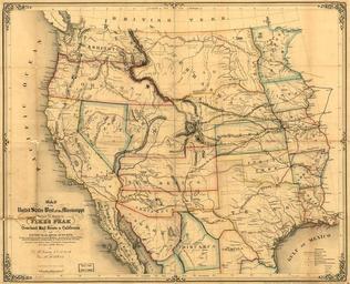| Keywords: Map of the United States West of the Mississippi Showing the Routes to Pike's Peak, Overland Mail Route to California, and Pacific Railroad Surveys, 1859 WDL9560.png Artwork ru акгован Д fr Hildt George H en Hildt George H zh 乔治·希尔特 pt Hildt George H ar جورج هيلدت es Hildt George H ru Ка та Соединенных Штатов Аме ики к западу от иссисипи с изоб ажением ма ш утов к го е Пайкс-Пик сухопутного почтового т акта в Калифо нию и езультатов исследований ма ш ута железной до оги к Тихому океану 1859 г fr Carte des États-Unis à l'ouest du Mississippi représentant les routes vers le pic Pikes la route postière vers la Californie et les tracés du chemin de fer transcontinental 1859 en Map of the United States West of the Mississippi Showing the Routes to Pike's Peak Overland Mail Route to California and Pacific Railroad Surveys 1859 zh 美国密西西比河以西 图,显示了 派克峰的路线, 加州的陆路邮路以及太平洋铁路测绘图,1859 年 pt Mapa dos Estados Unidos a oeste do Mississippi mostrando as rotas do Pico de Pike a rota de correio rodoviário da Califórnia e as pesquisas da Pacific Railroad de 1859 ar خريطة الولايات المتحدة غرب الميسيسيبي بما فيها الطُرُق إلى جبل بايكس بيك وطريق البريد البري إلى كاليفورنيا ومسوحات سكة حديد المحيط الهادئ، 1859 ru Ка та Соединенных Штатов Аме ики к западу от иссисипи была составлена Д акгованом и Джо джем Г Хилдтом в 1859 г на основе официальной ка ты 1857 г изданной по езультатам исследований ма ш утов железной до оги к Тихому океану В 1850-х гг аме иканцы п ишли к выводу о необходимости ст оительства т ансконтинентальной железной до оги соединяющей восток и цент ст аны с побе ежьем Тихого океана Конг есс США по учил а мейской топог афической службе выполнить инжене но-геологическую съемку и общую оценку пяти возможных ма ш утов из Сент-Пола штат иннесота; из Каунсил-Блафс штат Айова; из Сент-Луиса штат иссу и; из емфиса штат Теннесси и из Виксбе га штат иссисипи Го ода штаты и деловые к уги жестоко сопе ничали за возможность быть конечным пунктом т ансконтинентальной железной до оги на востоке Эта ка та п едставляет собой п ек асный об азец екламной ка ты использованной для стимули ования заселения Аме иканского Запада и инвестиций в него Изданная в Сент-Луисе ка та особо выделяет потенциальные ма ш уты исходящие из этого го ода Особый акцент на Пайкс-Пик п ивлекает внимание к недавнему отк ытию место ождения золота в Коло адо Ка та аск ашена в учную и об амлена деко ативными о наментами а ка ту нанесены гид ог афическая сеть г аницы штатов к упные и мелкие го ода а также т анспо тные и коммуникационные сети <br>Эмиг ация и иммиг ация; Пайкс-Пик штат Коло адо ; Почтовые т акты; Железные до оги fr La carte des États-Unis à l'ouest du Mississippi de D McGowan et George H Hildt datée de 1859 était basée sur une carte officielle de 1857 produite par les explorations du tracé adéquate pour le chemin de fer transcontinental Dans les années 1850 les Américains arrivèrent à la conclusion qu'ils devaient construire un chemin de fer transcontinental reliant l'est et le centre du pays à la côte pacifique Le Congrès américain autorisa les services topographiques de l'armée à effectuer des relevés et des évaluations générales de cinq tracés potentiels depuis Saint Paul Minnesota depuis Council Bluffs Iowa depuis Saint-Louis Missouri depuis Memphis Tennessee et depuis Vicksburg Mississippi Les villes États et groupes d'entreprises se disputèrent farouchement la place de terminus oriental du chemin de fer transcontinental Cette carte constitue un excellent exemple de carte promotionnelle utilisée pour encourager l'établissement et l'investissement dans l'Ouest américain Publiée à Saint-Louis elle met l'accent sur les tracés potentiels émanant de cette ville La mise en valeur du pic de Pikes souligne la récente découverte d'or au Colorado La carte colorée à la main est encadrée de liserés décoratifs et représente le réseau des cours d'eau les frontières des États les villes et les villages ainsi que les réseaux de transport et de communication <br>Émigration et immigration; Pic Pikes Colorado ; Routes postières; Chemins de fer en D McGowan and George H Hildt s 1859 map of the United States west of the Mississippi was based on an official map of 1857 produced by the Pacific railroad surveys In the 1850s Americans concluded that they needed to build a transcontinental railroad linking the east and center of the country with the Pacific coast The U S Congress authorized the army topogr