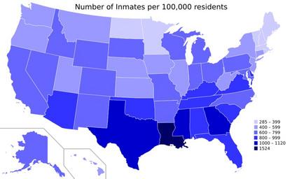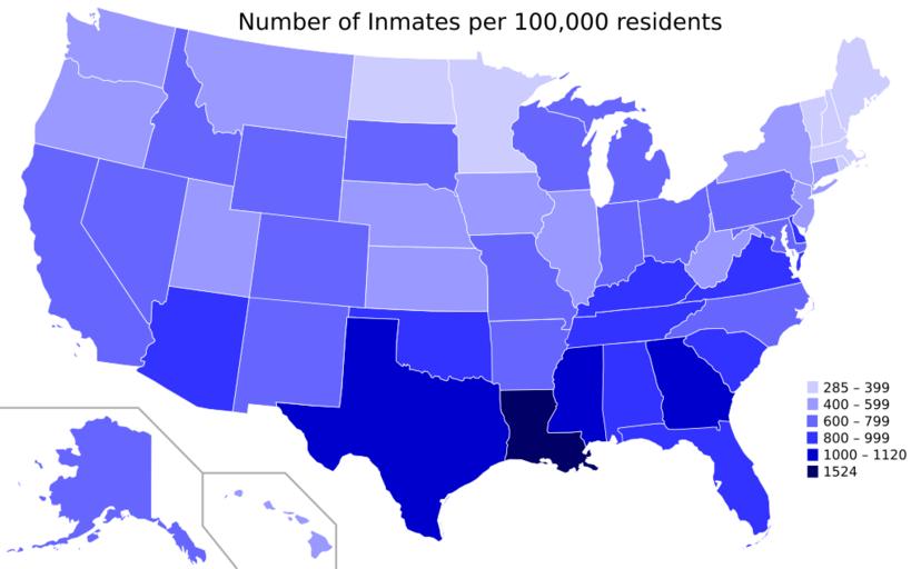 | Keywords: Map of US Jail and Prison Incarceration Rate-2006.svg translate yes en A visual representation of states in the United States by the rate of incarceration under the jurisdiction of state http //www bjs gov/index cfm ty tp tid 11 Total Correctional Population and local correctional authorities in 2006 including inmates in jails http //bjs ojp usdoj gov/content/pub/pdf/cjf06 pdf Table 12 2015-06-05 own Delphi234 other versions Data wikitable sortable colspan 3 1999 colspan 3 2006 - Location Prison Jail Total Prison Jail Total - Alabama 564 261 826 614 329 943 - Alaska 637 11 648 757 9 765 - Arizona 544 216 760 581 248 829 - Arkansas 447 189 637 488 219 708 - California 492 233 725 481 217 699 - Colorado 386 222 608 473 297 770 - Connecticut 568 568 587 587 - Delaware 927 927 842 842 - Florida 461 338 799 514 347 861 - Georgia 540 422 962 564 462 1026 - Hawaii 414 414 464 464 - Idaho 387 224 611 486 263 749 - Illinois 368 139 507 352 155 507 - Indiana 325 215 540 413 274 687 - Iowa 252 104 357 296 127 424 - Kansas 323 165 488 319 254 573 - Kentucky 387 262 649 476 393 869 - Louisiana 779 586 1365 863 660 1524 - Maine 137 89 226 160 124 285 - Maryland 447 212 658 409 233 642 - Massachusetts 184 174 358 171 205 377 - Michigan 473 158 631 511 180 691 - Minnesota 125 105 230 176 139 315 - Mississippi 659 321 980 724 396 1120 - Missouri 478 127 605 516 167 683 - Montana 334 172 507 377 207 584 - Nebraska 221 131 353 249 152 402 - Nevada 525 271 795 514 254 769 - New Hampshire 188 133 320 213 155 368 - New Jersey 387 207 593 314 211 524 - New Mexico 297 300 597 340 454 794 - New York 401 184 584 328 167 495 - North Carolina 406 174 580 423 200 623 - North Dakota 149 93 242 214 147 362 - Ohio 416 148 564 428 176 604 - Oklahoma 667 201 868 679 274 952 - Oregon 297 189 487 370 181 552 - Pennsylvania 305 225 530 357 289 646 - Rhode Island 303 303 374 374 - South Carolina 566 226 792 547 295 842 - South Dakota 342 145 487 430 209 638 - Tennessee 410 358 768 426 403 830 - Texas 814 289 1103 732 283 1015 - Utah 250 189 439 252 257 509 - Vermont 259 259 355 355 - Virginia 433 265 699 480 364 845 - Washington 253 183 437 275 202 477 - West Virginia 195 138 333 315 239 555 - Wisconsin 388 239 628 421 262 683 - Wyoming 357 210 566 410 308 718 - class sortbottom District of Columbia 1667 318 1986 649 - U S total 500 226 726 524 255 778 cc-zero Uploaded with UploadWizard Maps of imprisonment and detention rates Correctional population maps of the United States Imprisonment and detention rates in the United States |