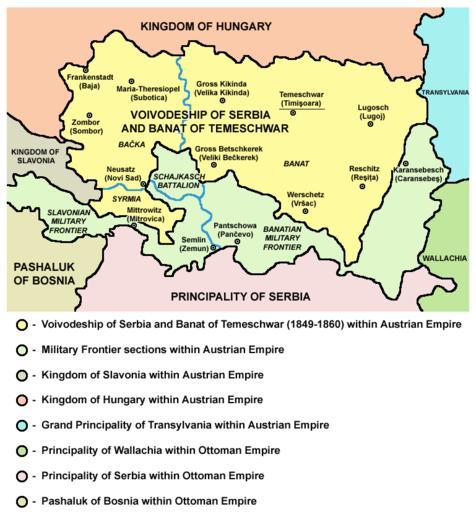 | Keywords: Map of Voivodeship of Serbia and Banat of Temeschwar (1849-1860).png English Voivodeship of Serbia and Banat of Temeschwar 1849-1860 Serbian Војводство С бија и Тамишки Банат 1849-1860 References Published references The Times History of Europe Times Books 2002 Sima M Ćirković Srbi među evropskim narodima Beograd 2004 Dr Tomislav Bogavac Nestajanje Srba Niš 1994 Dragomir Jankov Vojvodina - propadanje jednog regiona Novi Sad 2004 Istorijski atlas Zavod za udžbenike i nastavna sredstva - Zavod za kartografiju Geokarta Beograd 1999 Školski istorijski atlas Zavod za izdavanje udžbenika Socijalističke Republike Srbije Beograd 1970 Peter Rokai - Zoltan Đere - Tibor Pal - Aleksandar Kasaš Istorija Mađara Beograd 2002 Lazo M Kostić Srpska Vojvodina i njene manjine Novi Sad 1999 Drago Njegovan Prisajedinjenje Vojvodine Srbiji Novi Sad 2004 Čedomir Popov - Jelena Popov Autonomija Vojvodine - srpsko pitanje Sremski Karlovci 2000 Dr Dušan J Popović Srbi u Vojvodini knjiga 3 Novi Sad 1990 J H Šviker Politička istorija Srba u Ugarskoj Novi Sad - Beograd 1998 Sigfrid Kaper Srpski pokret u južnoj Ugarskoj 1848-1849 Beograd - Valjevo 1996 Dimitrije Boarov Politička istorija Vojvodine Novi Sad 2001 Dejan Mikavica Srpska Vojvodina u Habsburškoj monarhiji 1690-1920 Novi Sad 2005 Dr Milenko Palić Srbi u Mađarskoj - Ugarskoj do 1918 Novi Sad 1995 Drago Njegovan Srpska Vojvodina Enciklopedija Novog Sada knjiga 26 Novi Sad 2005 Istorija Vojvodine Enciklopedija Novog Sada sveska 5 Novi Sad 1996 Vladimir Ćorović Ilustrovana istorija Srba knjiga peta Beograd 2006 Vasilije Krestić Iz prošlosti Srema Bačke i Banata Beograd 2003 Slavko Gavrilović Srbi u Habsburškoj Monarhiji 1792-1849 Novi Sad 1994 Milan Tutorov Banatska rapsodija Novi Sad 2001 Jovan M Pejin Iz prošlosti Kikinde Kikinda 2000 Rodoljub Malenčić Miletić Novi Sad 1996 Čedomir Popov - Slavko Gavrilović Evropska revolucija i srpski pokret 1848-1849 Beograd - Novi Sad 1997 Internet references http //www sluzba vojvodina sr gov yu/SEKRETARIJATI-V/MANJINE/manjine-koliko-se-poznajemo/web-tekst/Brosura-ceo-tekst htm Bahovo_doba_-_Vojvodstvo_Srbija_i_Tamiški_Banat Bahovo doba - Vojvodstvo Srbija i Tamiški Banat in Serbian http //www thomasgraz net/glass/fj1titel htm Titles of Habsburg emperors http //www terra es/personal7/jqvaraderey/185915BK GIF Map http //terkepek adatbank transindex ro/kepek/netre/57 gif Map http //terkepek adatbank transindex ro/kepek/netre/256 gif Map http //www historyonmaps com/BWSamples/Magyarorszagadminsitrative html Map http //www lib utexas edu/maps/historical/balkans_1859 jpg Map Source and licence en PANONIAN Self-made map by PANONIAN PANONIAN Voivodeship of Serbia and Banat of Temeschwar Vojvodina map Habsburg Military Frontier Vojvodina map Maps of the Habsburg period in the history of Serbia Vojvodina map Maps of the history of Vojvodina Vojvodina map Maps of the history of Banat Vojvodina map Maps of the history of Bačka Vojvodina map Maps of the history of Syrmia Vojvodina map Maps of the Austrian Empire Vojvodina map |