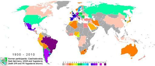 | Keywords: Map World Cup appearances (enwiki).png original upload log ¢ World Cup 1930 - 2010 880088 19 ” Brazil 18 no country dd00dd 17 ” Italy ¢ German Empire+West Germany+Germany 2+10+5 16 no country bb00ff 15 ” Argentina 8800ff 14 ” Mexico 4400ff 13 ” England ¢ France ¢ Spain 12 no country 0088ff 11 ” Belgium ¢ Sweden ¢ Uruguay ¢ ¢ SFR Yugoslavia+FR Yugoslavia/Serbia and Montenegro+Serbia 8+2+1 00ffff 10 ” SFR Yugoslavia+FR Yugoslavia/Serbia and Montenegro 8+2 ¢ West Germany 10 00ffaa 9 ” United States ¢ Hungary ¢ Netherlands ¢ Switzerland ¢ ¢ USSR+Russia 7+2 ¢ Czechoslovakia+Czech Republic 8+1 ¢ Czechoslovakia+Slovakia 8+1 23b14e 8 ” Chile ¢ Korea Republic ¢ Paraguay ¢ Scotland ¢ ¢ Czechoslovakia 8 ¢ SFR Yugoslavia 8 00dd44 7 ” Austria ¢ Bulgaria ¢ Poland ¢ Romania ¢ USSR 7 bbff00 6 ” Cameroon eeee00 5 ” Portugal ffbb00 4 ” Saudi Arabia ff8800 3 ” Australia ff9191 2 ” Turkey ffccbb 1 ” China ababab never qualified to the final round World cup maps Own BanRay 120px ImageNote 1 539 124 58 54 1357 628 2 France ImageNoteEnd 1 ImageNote 2 578 144 54 63 1357 628 2 Italy ImageNoteEnd 2 ImageNote 3 241 324 183 212 1357 628 2 Brazil ImageNoteEnd 3 ImageNote 4 606 455 92 71 1357 628 2 South Africa ImageNoteEnd 4 ImageNote 5 1180 151 83 109 1357 628 2 South Korea and Japan co hosted FIFA World Cup 2002 ImageNoteEnd 5 ImageNote 8 679 128 61 50 1480 628 2 France ImageNoteEnd 8 ImageNote 9 383 333 174 182 1480 628 2 Brazil ImageNoteEnd 9 ImageNote 10 401 439 68 176 1480 628 2 Chile ImageNoteEnd 10 ImageNote 11 411 456 78 161 1480 628 2 Argentina ImageNoteEnd 11 ImageNote 12 457 489 35 39 1480 628 2 Uruguay ImageNoteEnd 12 ImageNote 13 226 209 122 93 1480 628 2 Mexico ImageNoteEnd 13 ImageNote 14 105 44 350 211 1480 628 2 United States of America ImageNoteEnd 14 ImageNote 15 753 454 93 98 1480 628 2 South Africa ImageNoteEnd 15 ImageNote 16 660 157 61 56 1480 628 2 Spain ImageNoteEnd 16 ImageNote 17 722 143 22 20 1480 628 2 Switzerland ImageNoteEnd 17 ImageNote 18 679 107 35 39 1480 628 2 England ImageNoteEnd 18 ImageNote 19 720 146 57 57 1480 628 2 Italy ImageNoteEnd 19 ImageNote 20 736 46 48 72 1480 628 2 Sweden ImageNoteEnd 20 ImageNote 21 720 111 41 44 1480 628 2 Germany ImageNoteEnd 21 ImageNote 22 1180 144 89 115 1480 628 2 Japan and South Korea co-hosted in the 2002 FIFA World Cup ImageNoteEnd 22 Map World Cup 1930 - 2014 with WC 2014 Brazil is qualifity definite for 2014 mit WM 2014 File World cup appearances 2014 png <br> 250px <br> File Map World Cup appearances 2014 enwiki png <br> 250px FIFA World Cup Association football maps of the world |