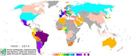 | Keywords: Map World Cup appearances 2014 (enwiki).png Map_World_Cup_appearances 1930-2014 own 2013-11-21 Dufo Image from German wikipedia The map shows the number of final round participation of the respective countries with the FIFA world championship colors indicated as down and the host countries black squares 7E007E 20 “ “ Brazil 19 no country D900D9 18 “ “ Italy ¢ Germany incl West Germany 1954-1990 17 no country B400FF 16 “ “ Argentina 7E00FF 15 “ “ Mexico 3A00FF 14 “ “ England ¢ France ¢ Spain 13 no country 0077FF 12 “ “ Belgium ¢ Uruguay 00B4FF 11 “ “ Sweden ¢ Serbia incl Yugoslavia 1930-1990 Serbia and Montenegro 1994-2006 01FFFF 10 “ “ Netherlands ¢ Switzerland ¢ United States ¢ Russia incl U S S R 1930-1990 008800 9 “ “ “ Chile ¢ Hungary ¢ South Korea ¢ Czech Republic incl Czechoslovakia 1930-1990 1BA943 8 “ “ “ Paraguay ¢ Scotland 00D93A 7 “ “ “ Austria ¢ Bulgaria ¢ Cameroon ¢ Poland ¢ Romainia C6FF00 6 “ “ “ Portugal ECEC2A 5 “ “ “ Colombia ¢ Japan ¢ Nigeria FFB400 4 “ “ “ Algeria ¢ Australia ¢ Croatia ¢ Costa Rica ¢ Denmark ¢ Iran ¢ Morocco ¢ Peru ¢ Sauda Arabia ¢ Tunisia FF7E00 3 “ “ “ Bolivia ¢ Ecuador ¢ Ghana ¢ Greece ¢ Honduras ¢ Ivory Coast ¢ Republic of Ireland ¢ Northern Ireland ¢ Norway ¢ South Africa FF8787 2 “ “ “ Egypt ¢ El Salvador ¢ New Zealand ¢ North Korea ¢ Slovenia ¢ Turkey FFC6B4 1 “ “ “ Angola ¢ Bosnia and Herzegovina ¢ Canada ¢ China ¢ DR Congo Zaire ¢ Cuba ¢ East Germany ¢ Haiti ¢ Indonesia ¢ Iraq ¢ Israel ¢ Jamaica ¢ Kuwait ¢ Senegal ¢ Slovakia ¢ Togo ¢ Trinidad and Tobago ¢ Ukraine ¢ United Arab Emirates ¢ Wales ababab never qualified to the final round The small diagram shows the former countries USSR Yugoslavia Czechoslovakia and GDR Alternative map Only World Cups from 1930 to 2010 Nur Weltmeisterschaften von 1930 bis 2010 File World_cup_appearances_2010 png <br> 250px <br> File Map World Cup appearances enwiki png <br> 250px All World Cups from 1930 to 2014 Alle Weltmeisterschaften von 1930 bis 2014 File World_cup_appearances_2014 png <br> 250px Dufo World cup maps ImageNote 1 539 124 58 54 1357 628 2 France ImageNoteEnd 1 ImageNote 2 578 144 54 63 1357 628 2 Italy ImageNoteEnd 2 ImageNote 3 241 324 183 212 1357 628 2 Brazil ImageNoteEnd 3 ImageNote 4 606 455 92 71 1357 628 2 South Africa ImageNoteEnd 4 ImageNote 5 1180 151 83 109 1357 628 2 South Korea and Japan co hosted FIFA World Cup 2002 ImageNoteEnd 5 ImageNote 8 679 128 61 50 1480 628 2 France ImageNoteEnd 8 ImageNote 9 383 333 174 182 1480 628 2 Brazil ImageNoteEnd 9 ImageNote 10 401 439 68 176 1480 628 2 Chile ImageNoteEnd 10 ImageNote 11 411 456 78 161 1480 628 2 Argentina ImageNoteEnd 11 ImageNote 12 457 489 35 39 1480 628 2 Uruguay ImageNoteEnd 12 ImageNote 13 226 209 122 93 1480 628 2 Mexico ImageNoteEnd 13 ImageNote 14 105 44 350 211 1480 628 2 The Untied States of America ImageNoteEnd 14 ImageNote 15 753 454 93 98 1480 628 2 South Africa ImageNoteEnd 15 ImageNote 16 660 157 61 56 1480 628 2 Spain ImageNoteEnd 16 ImageNote 17 722 143 22 20 1480 628 2 Switzerland ImageNoteEnd 17 ImageNote 18 679 107 35 39 1480 628 2 England ImageNoteEnd 18 ImageNote 19 720 146 57 57 1480 628 2 Italy ImageNoteEnd 19 ImageNote 20 736 46 48 72 1480 628 2 Sweeden ImageNoteEnd 20 ImageNote 21 720 111 41 44 1480 628 2 Germany ImageNoteEnd 21 ImageNote 22 1180 144 89 115 1480 628 2 Japan and South Korea co-hosted in the 2002 FIFA World Cup ImageNoteEnd 22 FIFA World Cup Association football maps of the world |