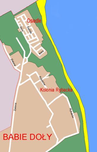 | Keywords: Mapa.dzielnicy.Babie.Doly.w.Gdyni.png Mapa gdyńskiej dzielnicy Babie Doły kolorem jasnobrązowym oznaczono obszar zabudowany kolorem zielonym oznaczono lasy kolorem żółtym oznaczono plażę kolorem niebieskim oznaczono Zatokę Gdańską kolorem szarym oznaczono tereny lotniska wojskowego na obszarze gminy Kosakowo czerwona linia oznacza granicę miasta Gdyni Autor Arek Babie Doły Maps of Gdynia Gmina Kosakowo | ||||