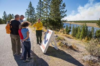 | Keywords: maple fire maplefire outdoor With the Maple Fire burning in the background, Public Information Officer Robert MacGregor answers questions about the role of wildfire in Yellowstone. NPS/Neal Herbert With the Maple Fire burning in the background, Public Information Officer Robert MacGregor answers questions about the role of wildfire in Yellowstone. NPS/Neal Herbert |