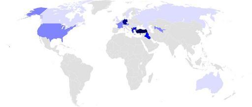 | Keywords: MapOfTurkishSpeakers-vector.svg Turkish speakers in the countries of the world by shades of blue based on Image BlankMap-World png The map shades the whole area within the national borders of each country with the colors defined in the legend below Numbers are partly based on Gordon Raymond G Jr ed 2005 Ethnologue Languages of the World Fifteenth edition http //www ethnologue com/show_language asp code tur Further references for the numbers are to be found at the end of Turkish diaspora article on the English Wikipedia Legend legend 000250 Official language Turkey Cyprus Macedonia at the municipal level Kosovo at the municipal level 00038c More than 1 000 000 speakers Germany 0006fc Between 500 000 - 1 000 000 speakers Bulgaria Iraq Greece 8184ff Between 100 000 - 500 000 speakers France Netherlands Belgium Austria United States Uzbekistan dddeff Between 25 000 - 100 000 speakers United Kingdom Australia Azerbaijan Canada Russia Sweden Denmark Switzerland Romania b9b9b9 Less than 25 000 speakers/No speakers Other countries τουρκόφωνους ληθυσμούς με α οχρώσεις του μ λε βασισμένος στον Image BlankMap-World png Οι σκιές στο χάρη καταλαμβάνουν όλη την εριοχή κάθε χώρας με τα χρώματα ου καθορίζονται στη λεζάντα ου ακολουθεί Τα νούμερα βασίζονται εν μέρει στο Gordon Raymond G Jr ed 2005 Ethnologue Languages of the World Fifteenth edition http //www ethnologue com/show_language asp code tur Λεζάντα legend 000250 Ε ίσημη γλώσσα Τουρκία Κύ ρος ΠΓΔ της ακεδονίας σε δημοτικό ε ί εδο Κόσοβο σε δημοτικό ε ί εδο 00038c Πάνω α ό 1 000 000 ομιλητές Γερμανία 0006fc Ανάμεσα σε 500 000 και 1 000 000 ομιλητές Βουλγαρία 8184ff Ανάμεσα σε 100 000 και 500 000 ομιλητές Γαλλία Ολλανδία Βέλγιο Αυστρία ΗΠΑ Ουζμ εκιστάν dddeff Ανάμεσα σε 25 000 και 100 000 ομιλητές Ελλάδα Ηνωμένο Βασίλειο Αυστραλία Αζερμ αϊτζάν Καναδάς Ρωσία Σουηδία Δανία Ελβετία Ρουμανία b9b9b9 Λιγότεροι α ό 25 000 ομιλητές ή καθόλου ομιλητές Οι υ όλοι ες χώρες Türkisch-Sprecher auf der Welt in blauen Farbabstufungen basierend auf Image BlankMap-World png The map shades the whole area within the national borders of each country with the colors defined in the legend below Numbers are partly based on Gordon Raymond G Jr ed 2005 Ethnologue Languages of the World Fifteenth edition http //www ethnologue com/show_language asp code tur Further references for the numbers are to be found at the end of Turkish diaspora article on the English Wikipedia Legende legend 000250 Amtssprache Türkei Zypern Mazedonien regional Kosovo regional 00038c Mehr als 1 000 000 Sprecher Deutschland 0006fc Zwischen 500 000 1 000 000 Sprecher Bulgarien Irak Griechenland 8184ff Zwischen 100 000 500 000 Sprecher Frankreich Niederlande Belgien Österreich Vereinigte Staaten Usbekistan dddeff Zwischen 25 000 100 000 Sprecher Großbritannien Australien Aserbaidschan Kanada Russland Schweden Dänemark Schweiz Rumänien b9b9b9 Weniger als 25 000 Sprecher/keine Andere Länder Turks sprekenden in de landen van de wereld met tinten van de kleur blauw gebaseerd op Image BlankMap-World png De kaart kleurt het hele gebied binnen de nationale grenzen van elk land met de kleuren die zijn gedefinieerd in de legenda hieronder Nummers zijn gedeeltelijk gebaseerd op Gordon Raymond G Jr ed 2005 Ethnologue Languages of the World Vijftiende editie http //www ethnologue com/show_language asp code tur Verdere verwijzingen voor de nummers zijn te vinden aan het einde van het artikel Turkse diaspora in de Engelstalige Wikipedia Legenda legend 000250 Officiële taal Turkije Cyprus Macedonië op gemeentelijk niveau Kosovo op gemeentelijk niveau 00038c Meer dan 1 000 000 sprekers Duitsland 0006fc Tussen 500 000 - 1 000 000 sprekers Bulgarije Irak Griekenland 8184ff Tussen 100 000 - 500 000 sprekers Frankrijk Nederland België Oostenrijk Verenigde Staten Oezbekistan dddeff Tussen 25 000 - 100 000 sprekers Verenigd Koninkrijk Australië Azerbeidzjan Canada Rusland Zweden Denemarken Zwitserland Roemenië b9b9b9 Minder dan 25 000 sprekers / geen De overige landen língua turca nos países do mundo em tons de azul com base na Image BlankMap-World png Os tons do mapa estão em toda a área dentro das fronteiras nacionais de cada país com as cores definidas na legenda abaixo Os números são parcialmente baseados em Gordon Raymond G Jr ed 2005 Ethnologue Languages of the World edição XV http //www ethnologue com/show_language asp code tur Outras referências para os números podem ser encontrados no final do artigo Diaspora Turca na Wikipédia em Inglês Legenda legend 000250 Língua oficial Turquia Chipre Macedônia a nível municipal e Kosovo a nível municipal ; 00038c Mais de 1 000 000 de falantes Alemanha; 0006fc Entre 500 000 e 1 000 000 falantes Bulgária Iraque e Grécia; 8184ff Entre 100 000 e 500 000 falantes França Países Baixos Bélgica Áustria Estados Unidos e Uzbequistão; dddeff Entre 25 000 e 100 000 falantes Reino Unido Austrália Azerbaijão Canadá Rússia Suécia Dinamarca Suíça e Romênia; b9b9b9 Menos de 25 000 falantes/nenhum falante Demais países Turski nijanse plave pokazuje broj osoba koji govore Image BlankMap-World png napravio koristeći kartu Cijelo je područje unutar granica svake države sljedeće definicije su ispunjene bojama Broj zemalja prvenstveno za tursko-govornog ljudi Gordon Raymond G Jr ur 2005 Narodoznanstvo jezicima svijeta Petnaesti izdanje http //www ethnologue com/show_language asp code tur izvor je korišten Ostali izvori Turski Wikip