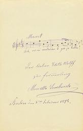 | Keywords: Marcella Sembrich Albumblatt.jpg Marcella Sembrich Albumblatt mit Unterschrift Berlin 8 Februar 1898 Notenzitat Deh vieni non tardar aus Mozarts Le nozze di Figaro gewidmet der lieben Edith Wolff zur Erinnerung Marcella Sembrich http //www bassenge com/ 1898-02-08 Marcella Sembrich 1858-1935 PD-old-70-1923 Images from Galerie Bassenge Marcella Sembrich Le nozze di Figaro 1898 in Berlin 1898 documents | ||||
