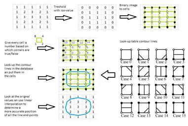 | Keywords: Marchingsquaresalgorithm.png Marching_squares_algorithm svg Marching Squares Algorithm Marching Squares is an algorithm which can be used to extract isocontour geometry from an 2D image This algorithm is the 2D equivalent of isosurface extraction using Marching Cubes in 3D es Esta imagen describe los pasos del Algoritmo de Cuadrados Marchantes Este algoritmo puede ser usado para extraer los isocontornos de una imagen 2D Cuadrados Marchantes es el equivalente 2D al algoritmo de Cubos marchantes para el caso de extracción de isosuperficies en 3D own Djexplo 2011-02-24 Cc-zero Marching squares |