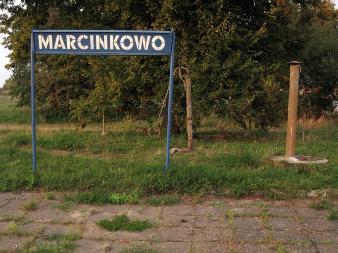 Keywords: Marcinkowo railway station 02.JPG pl Tablica stacji kolejowej w Marcinkowie Own Wesoły Geodeta Marcinkowo train station