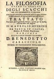 | Keywords: Marco Aurelio Severino - La filosofia overo il perche degli scacchi 1690 007.jpg it La filosofia overo il perche degli scacchi per cui chiaramente si mostra prima l'artificio della fabrica universale poscia la ragion particolare della ordinanza degli andamenti tutti degli scacchi trattato non tanto per lo gradevole scherzo quanto per la riposta contezza delle cose pregiato di M Aurelio Severino da Tarsia su' Crathi Medico Filosofo Napoletano Dedicato all'illustrissimo signore D Benedetto Caracciolo Signor di Pannarano negl'Hirpini http //elea unisa it/ Elea - Archivio aperto istituzione dell'Università di Salerno Institution CBA UNISA PD-old-70-1923 CBA UNISA Marco Aurelio Severino Media from CBA UNISA |