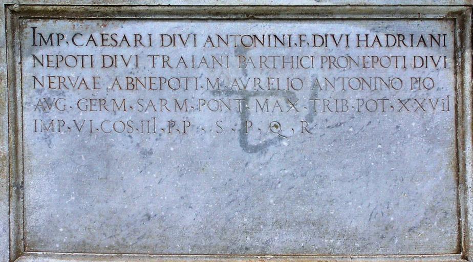 Keywords: Marcus.aurelius.inscription.rome.arp.jpg The inscription on the plinth of the replica statue of Roman Emperor Marcus Aurelius in the Piazza Campidoglio Rome Italy The original is in the nearby Capitoline Museum I do not know what the inscription says The inscription says To Marcus Aurelius Antoninus son of the deified emperor Caesar Antoninus grandson of the deified Hadrian great-grandson of the deified Trajan who conquered the Parthians great-great-grandson of the deified Nerva pious august conqueror of the Germans and Sarmates supreme pontiff invested 27 times with the tribunician powers proclaimed as imperator 6 times elected consul 3 times father of his country from the Senate and the people of Rome Photographed by Adrian Pingstone in June 2007 and placed in the public domain Arpingstone Replica of the Equestrian statue of Marcus Aurelius Rome Taken with Olympus C-750UZ Latin inscriptions in Rome |