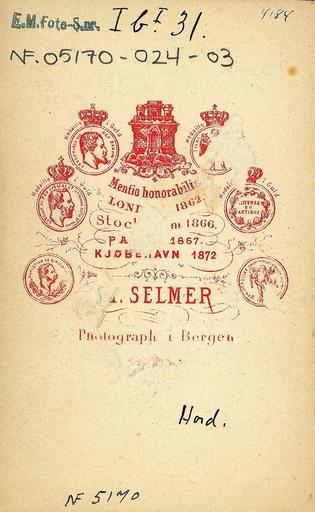 | Keywords: Marcus Selmer Pige fra Rosendal i Kvindherred NF.05170-024, bilde 2.jpg nb Baksiden av kort som viser jentedrakt fra Rosendal Kvinnherad Portrett av jente/kvinne stående utendørs i naturen med bæreredskap på ryggen antakelig en lagget ryggbøtte for melketransport Håndkolorert Fra serien Norske Nationaldragter tatt av fotograf Marcus Selmer 1819-1900 Bergen Billedarkivet Norsk Folkemuseum 1867 NF NF 05170-024 116-pige-fra-rosendal-i-kvindherred Creator Marcus Selmer <gallery> File Marcus Selmer Pige fra Rosendal i Kvindherred NF 05170-024 jpg </gallery> PD-old-100 Cartes de visite of Norway Photographs by Marcus Selmer |