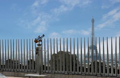 Keywords: margit wallner paris fence eiffel tower view travel binoculars europe arc de triumph landmark sky clouds distant peaceful longing see