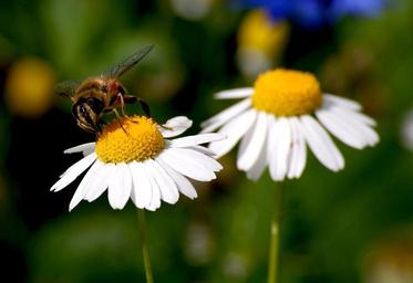 Keywords: marguerite bee blossom bloom insect flower plant nature close summer pollen pollination food intake nature recording flora yellow white