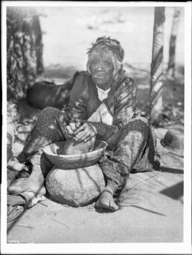 | Keywords: Maria Casseri, a Coahuilla Indian woman, grinding mesquite beans for flour on a stone metate with a basket top, California, ca.1899 (CHS-4746).jpg en <br> Maria Casseri a Coahuilla Indian woman grinding mesquite beans for flour on a stone metate with a basket top California ca 1899 Photograph of a Maria Casseri a Coahuilla Indian woman grinding mesquite beans for flour on a stone metate with a basket top California ca 1899 She can be seen seated on a blanket on the ground with the grinding stone between her ankles She wears a long-sleeved sweater with a white shirt underneath and printed pants She has short white hair wrapped with a headband A dog and other items can be seen behind her Call number CHS-4746 Photographer James George Wharton Filename CHS-4746 Coverage date circa 1899 Part of collection California Historical Society Collection 1860-1960 Format glass plate negatives Type images Part of subcollection Title Insurance and Trust and C C Pierce Photography Collection 1860-1960 Repository name USC Libraries Special Collections Accession number 4746 Microfiche number 1-172- Archival file chs_Volume98/CHS-4746 tiff Repository address Doheny Memorial Library Los Angeles CA 90089-0189 Geographic subject country USA Format aacr2 3 photograph glass photonegative photoprints b w ; 22 x 17 cm 21 x 26 cm Rights Digitally reproduced by the USC Digital Library; From the California Historical Society Collection at the University of Southern California Subject adlf tribal areas Project USC Repository email specol usc edu Identifying number unidentified no James-2010 Contributing entity California Historical Society Date created circa 1899 Publisher of the digital version University of Southern California Libraries Format aat photographic prints; photographs Geographic subject state California Legacy record ID chs-m17055; USC-1-1-1-13920 Access conditions Send requests to address or e-mail given Phone 213 821-2366; fax 213 740-2343 Subject file heading Indians -- Mission -- Cahuilla Subject lcsh Indians of North America; Cahuilla Indians Subject Mission Indians; Cahuilla Indians; Casseri Maria; Coahuilla Indians; Mission Indians circa 1899 date created James George Wharton http //digitallibrary usc edu/cdm/ref/collection/p15799coll65/id/17068 PD-old-70-1923 Images from USC Digital Library uploaded by Fæ California Historical Society Collection 1860-1960 Glass plate negatives Cahuilla Cahuilla baskets Photographs by George Wharton James Prosopis |