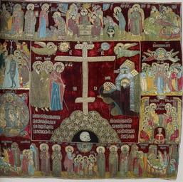 | Keywords: Maria and Sergius of Radonezh (Sergiev Posad).jpg Явление Богомате и Се гию и п аздники Пелена 1525 г Вклад великого князя Василия III и великой княгини Соломонии Дати овка 16 в 1525 г ате иал Ба хат камка шелковые се еб яные и золотные нити есто х анения Се гиево-Посадский госуда ственный исто ико-художественный музей-заповедник П оисхождение П оисходит из Т оице-Се гиевой лав ы Разме 108 x 114 Сох анность и естав ация Рестав и ована в 1958 г в ГЦХР им И Э Г аба я П Рябовой и Т А Даниловой О пе воначальном виде пелены позволяют судить сведения д евних монасты ских документов Во Вкладной книге 1673 г на л 47-47 об записано Госуда я ж великого князя Василия Ивановича вкладу написано в изных отписных книгах 83 1575 году пелена отлас синь а се едина - че вчат а на ней к ест жемчюгом сажен около к еста п аздники и святые шиты золотом и се еб ом венцы жемчюгом сажены П и к есте Видение чюдотво ца Се гия венцы жемчюгом сажены подпись у к еста и у Видения жемчюгом сажено а той же пелене четы надцать каменей подложена тафтою Писана в книгах пе вая пелена Такое же описание соде жит и Опись 1641 г л 126 В Описи же 1701 г л 154 мы находим эту пелену пе еложенной на че вчатый к асный ба хат Описание а с еднике изоб ажено Явление Богомате и с апостолами Иоанном и Пет ом Се гию Радонежскому и его ученику ихею а каймах вышиты п аздники и святые аве ху Благовещение Иоанн Златоуст Богомате ь Боголюбская с молящимся пе ед ней мит ополитом Пет ом ветхозаветная Т оица Иоанн П едтеча а хангел Гав иил и Рождество Х истово а левой кайме - К ещение и Отечество ; на п авой - Вознесение и Сошествие Святого Духа на апостолов Внизу Рождество и Зачатие Бого одицы мит ополиты Пет и Алексей молящиеся Спасу - по сто онам семи б атьев аккавеев их учитель Елеоза и мать Соломония Василий Па ийский и Леонтий Ростовский Зачатие и Рождество Иоанна П едтечи Внизу с едника по сто онам Голгофы шитая жемчугом надпись Все изоб ажения шиты азноцветными шелками нимбы и отдельные детали - золотом; швы атласный и в п ик еп клопец ягодка го одок Д евние фоны на с еднике - вишневая камка на каймах - синяя видны лишь в местах ут ат шитья Фоном служит новый темно-к асный ба хат Жемчужное шитье позднее асте ская великой княгини Соломонии Ю ьевны XVI в http //lib pstgu ru/icons/index2 php option com_content view article id 169057335 3C 1525 Вклад великого князя Василия III и великой княгини Соломонии PD-old-100 Embroidery in Museum of Sergiev Posad 16th-century Russian orthodox embroidery Icons of the True Cross Sergius of Radonezh in embroidery Vasily III of Russia Saint Sophia of Suzdal Pelena Embroidery of Russian tsarinas and Grand Duchess |