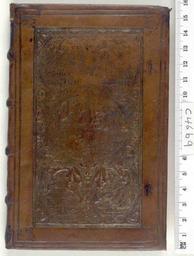 | Keywords: Maria Stuarta Regina Scotiae ... Martyr Ecclesie, innocens caede Darleana. - Upper cover (c46b9).jpg Style Panel design Religious miscellaneous; Caption Upper cover; Colour Brown; Edge Unspecified exhibition history Decorative Technique Panel stamp in gold Tooled in gold; Cover Material Calf Traces of 2 pairs of ties Bound 1550-1600 Macchi states; Panel stamp upper cover decorated with MATHEVS/MARCVS top and LVCAS/JOHANNES bottom inscription while on lower panel-stamp GREGORIVS/AMEROSTVS top scarcely readable /AVGVSTINUS bottom can be read Considering technical difficulties panel-stamp cutter was probably an experienced workman Martin Breaslauer Inc Catalogue 110 p 104 n 57 on Sacra Biblia ad vetustisssima exemplaria castigata Frankfurt Georg Corvinus for Sigmund Feyerabend 1571 proposes a similar south German binding provided on the upper cover with a panel-stamp 130x78 mm decorated with in its center a roundel of the Crucifixion to the left the Centurion to the right Adam sitting on his tomb and Moses with the staff of the brazen serpent behind him John 3 14 within the inscription ECCE AGNUS DEI QUI TOLLIT PE/IPESE VVULNERATUS EST PROPTER INI on its side two angels In the corners the Evangelists with their attributes within leafy wreaths In the central panel of the lower cover an ornamental plaque 130 x 78 mm object history Text 1588; Ingolstadt; Unspecified object type Cc-zero place of creation Binding Germany place of discovery Unspecified British Library image http //www bl uk/catalogues/bookbindings/LargeImage aspx RecordId 020-000007430 ImageId ImageId 43320 Copyright BL Maria Stuarta Regina Scotiae Martyr Ecclesie innocens caede Darleana Uploaded with GWToolset Maria Stuarta Regina Scotiae Martyr Ecclesie innocens caede Darleana - Upper cover c46b9 http //www webarchive org uk/bldatasets/bindings/7847_4 jpg Bookbinding 16th-century bookbinding British Library Bookbindings |