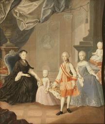 | Keywords: Maria Theresia of Austria grandmother.jpg Empress Maria Theresa with her son the Grand Duke of Tuscany daughter in law and two oldest children de Maria Theresia als Witwe Leopold II und seine Gattin Maria Ludovica sowie zwei ihrer Kinder Gouache 1768; Schloß Schönbrunn 1768 gouache Institution Schönbrunn http //text habsburger net/module/seid-fruchtbar-und-vermehret-euch/seid-fruchtbar-und-vermehret-euch/MB-ST_D5-MOD3-01 jpg/ size preview plus 1 other versions <gallery>Empress Maria Theresa with her son the Grand Duke of Tuscany daughter in law and two oldest children in 1768 by an unknown artist jpg</gallery> PD-old-100 DEFAULTSORT 1768; House of Habsburg-Lorraine Antonio Bencini 18th-century portrait paintings in the Palace of Schönbrunn Portrait paintings of Maria Theresa of Austria Portraits of Leopold II Holy Roman Emperor Maria Luisa of Spain Maria Theresa of Austria 1767-1827 Francis II Holy Roman Emperor House of Habsburg-Lorraine 1768 portrait paintings M 18th-century family portraits of royalty 18th-century gouache portraits 18th-century portrait paintings at full length Blue drapery in portrait paintings Breeches in art Crowns on cushions in portrait paintings Ermine clothing in art Group portraits with 5 persons Lace sleeves in art Pilasters in portraits Portrait paintings of widows in mourning Portraits with image of family member Sash of the Military Order of Maria Theresa in portrait paintings Tassels in portrait paintings Uploaded with UploadWizard |