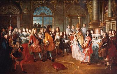 | Keywords: Mariage du duc de Bourgogne le 7 décembre 1697, tableau d'Antoine Dieu. Versailles.jpg fr Mariage de Louis de France Duc de Bourgogne et de Marie-Adelaïde de Savoie célébré le 7 décembre 1697 par le cardinal de Coislin huile sur toile 1715 carton de tapisserie commandé par Louis XIV pour la manufacture royale des Gobelins en 1710 pour la tenture de l'histoire du roi Princess Maria Adelaide of Savoy at Versailles on December 1697; present are the King Dauphin the Dukes of Anjou Berry Orléans and Chartres http //www4 culture fr/patrimoines/patrimoine_monumental_et_archeologique/sdx/api-url/getatt app fr gouv culture inventaire revue id am001-833_img23 1715 Antoine DIEU French c 1662-1727 PD-old-100 Antoine Dieu Louise Bénédicte de Bourbon Elisabeth Charlotte of the Palatinate Élisabeth Charlotte d'Orléans Louis XIV of France in paintings Louis Duke of Burgundy Louis Grand Dauphin Louis Alexandre Count of Toulouse Louise Françoise de Bourbon Paintings of Philip V of Spain Marie Adélaïde of Savoy Marie Thérèse de Bourbon 1690s fashion 1715 paintings 1710s fashion Arranged marriage Christian wedding in art Cushions in art Events in Versailles Former chapels of the Palace of Versailles Oil paintings of people Family portraits of French rulers People with dogs in art Tapestry cartoons Wedding ceremonies in France Brides and grooms in art 1697 Pierre du Cambout de Coislin Group portraits with many people Princes of the blood in art Princesses of the blood in art Royal wedding celebrations Philippe Duke of Orléans Regent of France Group portraits of royal families Philip V of Spain while Duke of Anjou Françoise Marie de Bourbon The marriage of the Duke of Burgundy to Marie Adelaïde of Savoy on December 7 1697 by Antoine Dieu ImageNote 1 300 170 35 205 750 478 2 King Louis XIV ImageNoteEnd 1 ImageNote 2 471 238 16 141 750 478 2 Princess Marie Adelaïde of Savoy ImageNoteEnd 2 ImageNote 3 485 166 25 56 750 478 2 The Cardinal de Coislin ImageNoteEnd 3 ImageNote 4 215 201 25 171 750 478 2 Louis Grand Dauphin ImageNoteEnd 4 ImageNote 5 611 193 29 71 750 478 2 Elisabeth Charlotte Liselotte of the Palatinate Duchess of Orléans Sister-in-law of Louis XIV ImageNoteEnd 5 ImageNote 6 553 215 22 187 750 478 2 Philippe of France Duke of Orléans grandfather of Princess Adelaïde of Savoy ImageNoteEnd 6 ImageNote 7 405 206 19 125 750 478 2 Louis of France Duke of Burgundy ImageNoteEnd 7 ImageNote 8 366 218 8 108 750 478 2 Philippe of France Duke of Anjou Future King of Spain ImageNoteEnd 8 ImageNote 9 386 208 8 26 750 478 2 Charles of France Duke of Berry ImageNoteEnd 9 ImageNote 10 583 197 18 20 750 478 2 Élisabeth Charlotte d'Orléans future Duchess of Lorraine ImageNoteEnd 10 ImageNote 11 650 192 8 25 750 478 2 Françoise Marie de Bourbon Duchess of Chartres Illegitimate daughter of king Louis XIV ImageNoteEnd 11 ImageNote 12 656 223 26 170 750 478 2 Philippe d'Orléans Duke of Chartres future Regent of France and Duke of Orléans ImageNoteEnd 12 |