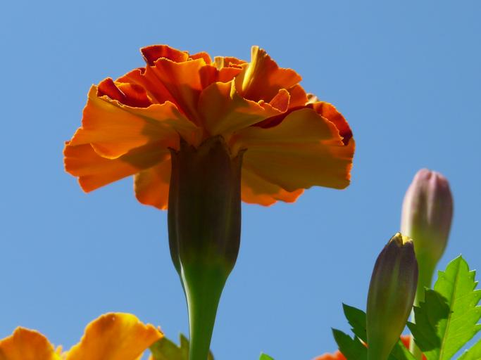 Keywords: marigold blossom bloom red orange sky blue beautiful colorful color marigolds turkish carnation dead flower summer flower balcony flower balcony plant plant flora flower composites asteraceae