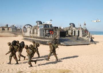| Keywords: US Navy 020715-N-9909C-001 U.S. Marine beach assault.jpg en Barking Sands Kauai HI Jul 15 2002 -- U S Marines from Battalion Landing Team 2/3 Special Purpose Marine Air Ground Task Force Three off load from Landing Craft Air Cushion LCAC-47 as part of a beach assault exercise during the Rim of the Pacific RIMPAC 2002 multinational amphibious training exercise LCAC-47 attached to Assault Craft Unit Five ACU-5 from Camp Pendleton CA launched from the amphibious assault ship USS Tarawa LHA 1 An H-3H Sea King helicopter from Pacific Missile Range Facility Barking Sands hovers overhead and serves as a safety observer Seven Pacific Rim nations and the United Kingdom are participating in RIMPAC 2002 U S Navy photo by Lt Cmdr Jane Campbell RELEASED 2002-07-15 020715-N-9909C-001 Navy http //www navy mil/view_image asp id 1947 U S Navy photo by Lt Cmdr Jane Campbell PD-USGov-Military-Navy Pacific Missile Range Facility Barking Sands RIMPAC 2002 United States Marine Corps power projection Military exercises of the United States Marine Corps LCAC-47 ship 1992 |