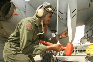 | Keywords: Marines Power Prowlers Into Iraqi Sky DVIDS28178.jpg en AL ASAD Iraq June 18 2006 - Lance Cpl Sedric L Simon hammers a drop tank fin into place on an EA-6B Prowler belonging to Marine Tactical Electronic Warfare Squadron 2 Marine Aircraft Group 16 Reinforced 3rd Marine Aircraft Wing at Al Asad Iraq June 18 Simon is a plane captain and power plant mechanic with the squadron's Powerline Division The division's Marines are responsible for preflight and postflight inspections engine maintenance external and internal fuel system maintenance as well as acting as the plane captains for the aircraft Simon is a West Palm Beach Fla native 2006-06-18 Lance Cpl Brian Holloran https //www dvidshub net/image/28178 28178 2006-08-19 09 35 AL ASAD IQ PD-USGov EA-6B Prowler US Marine Corps Images from DoD uploaded by Fæ |