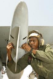 | Keywords: Marines Power Prowlers Into Iraqi Sky DVIDS28179.jpg en Lance Cpl Sedric L Simon replaces a drop tank fin attached to an EA-6B Prowler belonging to Marine Tactical Electronic Warfare Squadron 2 Marine Aircraft Group 16 Reinforced 3rd Marine Aircraft Wing at Al Asad Iraq June 18 Simon is a plane captain and power plant mechanic with the squadron's powerline division The division's Marines are responsible for preflight and post-flight inspections engine maintenance external and internal fuel system maintenance as well as acting as the plane captains for the aircraft Simon is a West Palm Beach Fla native 2006-06-18 Lance Cpl Brian Holloran https //www dvidshub net/image/28179 28179 2006-08-19 09 35 AL ASAD IQ 4 PD-USGov EA-6B Prowler US Marine Corps Images from DoD uploaded by Fæ |