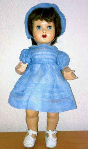 | Keywords: Mariquita Pérez, hacia 1954.jpg es Mariquita Pérez Muñeca de cartón piedra con pelo corto con flequillo y ojos azules durmientes Pintura al duco Altura 46 cm Período 1954-1958 Madrid Muñecas Florido Cabello castaño corto Los ojos son azules durmientes Las cejas están trazadas con aerógrafo las pestañas inferiores están pintadas a trazo y las superiores son naturales con los lagrimales y orificios nasales señalados con un puntito rojo; la boca la tiene abierta y muestra dos dientes superiores Tiene orejas En la barbilla y rodillas presenta unas hendiduras a modo de hoyuelos Mueve la cabeza los brazos y las piernas La manos abiertas y sin modelar Vestido confeccionado en organdí con apresto y ligamento tafetán de color azul con capota a juego Cuello vuelto redondo mangas cortas de tipo farol Bies del mismo tejido en el borde y adornadas por tres bandas estrechas del mismo tejido aplicadas sobre el tejido base mediante unos pespuntes mecánicos en hilo azul Corte a la altura del pecho Falda fruncida El cuerpo y la falda se guarnecen con las mismas bandas decorativas de las mangas En el cuerpo se disponen en el centro coincidiendo con las mangas y en la falda en las proximidades del bajo Abierto parcialmente en la espalda se cierra con tres botones forrados del mismo tejido y tres presillas de hilo Ropa interior compuesta por combinación y braga de algodón En este cuarto modelo de la muñeca de cartón piedra el cuerpo es mas estilizado y no lleva marca posterior alguna no así las realizadas en los talleres de Nuñez de Balboa por lo que esta pieza fue realizada por Muñecas Florido own Jafd88 2012 Dolls Dolls from Spain Cc-zero |