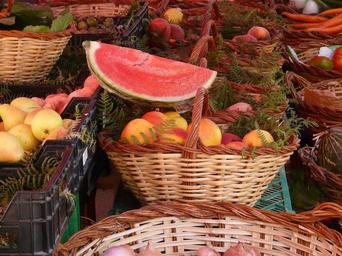 Keywords: market fruits melon peaches basket sell