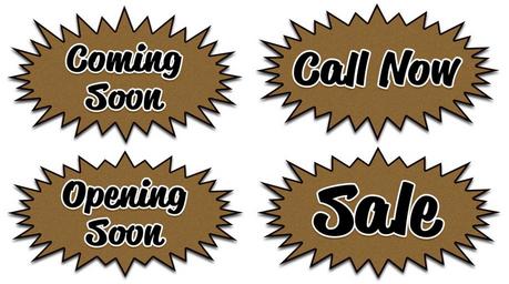 | Keywords: marketing sales promotions advertising sticker banner burst discount event commerce for sale merchandise offer announcement buy sell shop notice retail ad gold black text call out coming soon coming soon now open opening opening soon promote business |