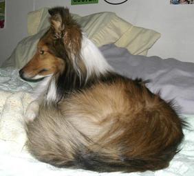 Marley, a Shetland sheepdog, lying on a bed - 20051210.jpg (2141x1945)