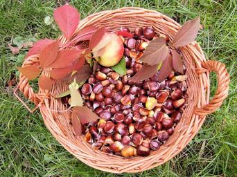 Keywords: maroni fall autumn sweet chestnuts autumn fruits basket decoration vine colorful red color palatinate odenwald