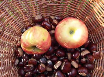 Keywords: maroni sweet chestnuts autumn fruits basket collect chestnut brown apple harvest